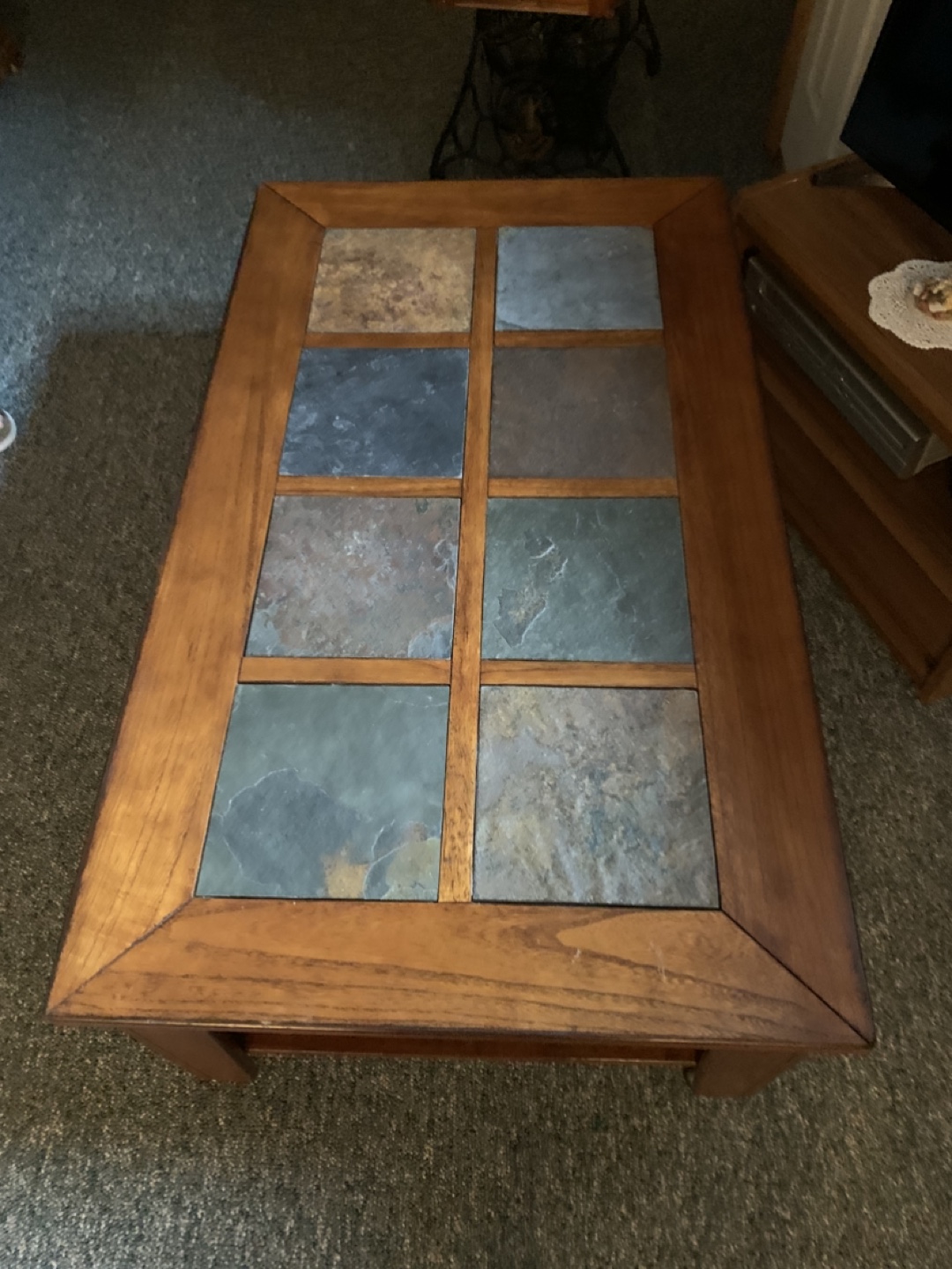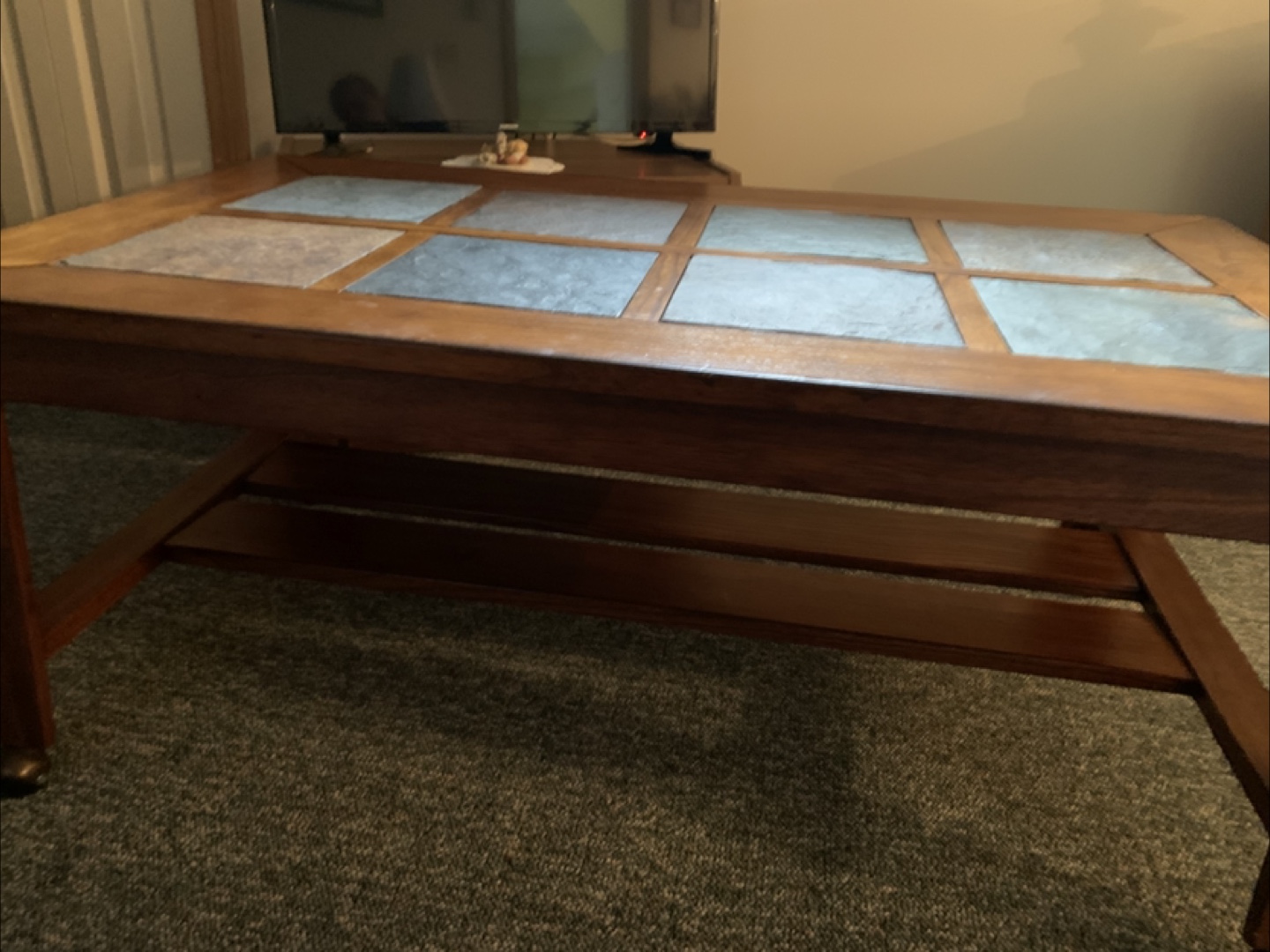 A lovely wood coffee table featuring a tile inlay on top. It's a great addition to any living room or den! Only a few years old.