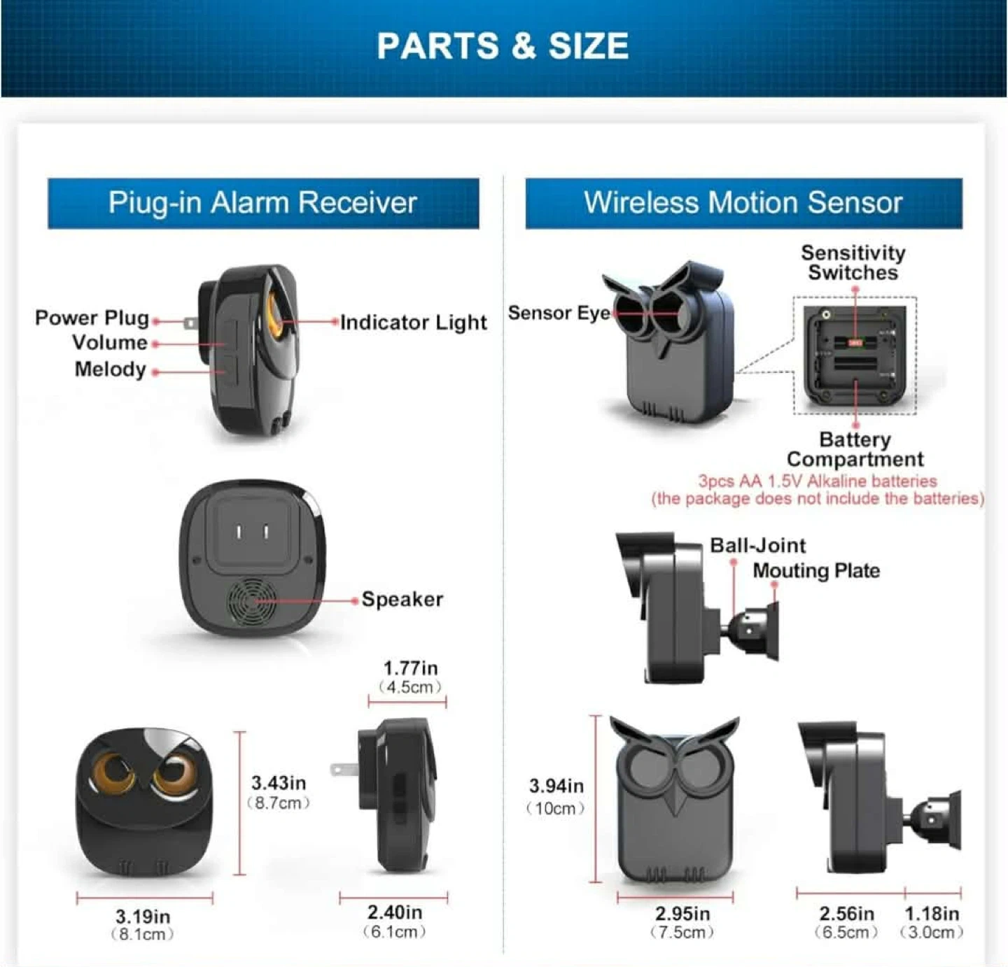 This wireless motion sensor alarm system detects movement from people, vehicles, and animals. It features a plug-in receiver with 35 optional melodies and 4 volume levels. The sensor has a detection range up to 50 feet and a wireless transmission range of up to 1/2 mile.