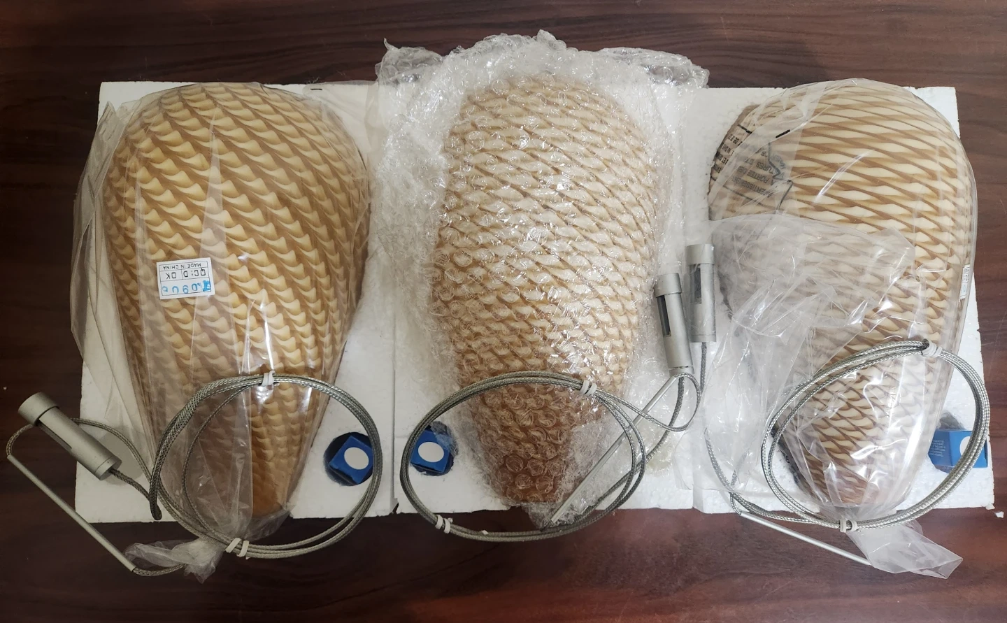 I'm selling a set of three brand new Tiella Honey Pendant lights! These amber honey pendant lights come with an adjustable 5' cord and a 35-watt halogen bulb. They also include a rail connector and easy-to-follow instructions! The original box is included as well