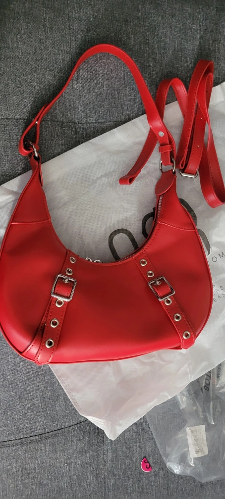 Features: Faux leather exterior, textile lining, silver-tone hardware, magnetic snap closure, one interior slip pocket, and double buckle detail.