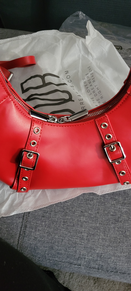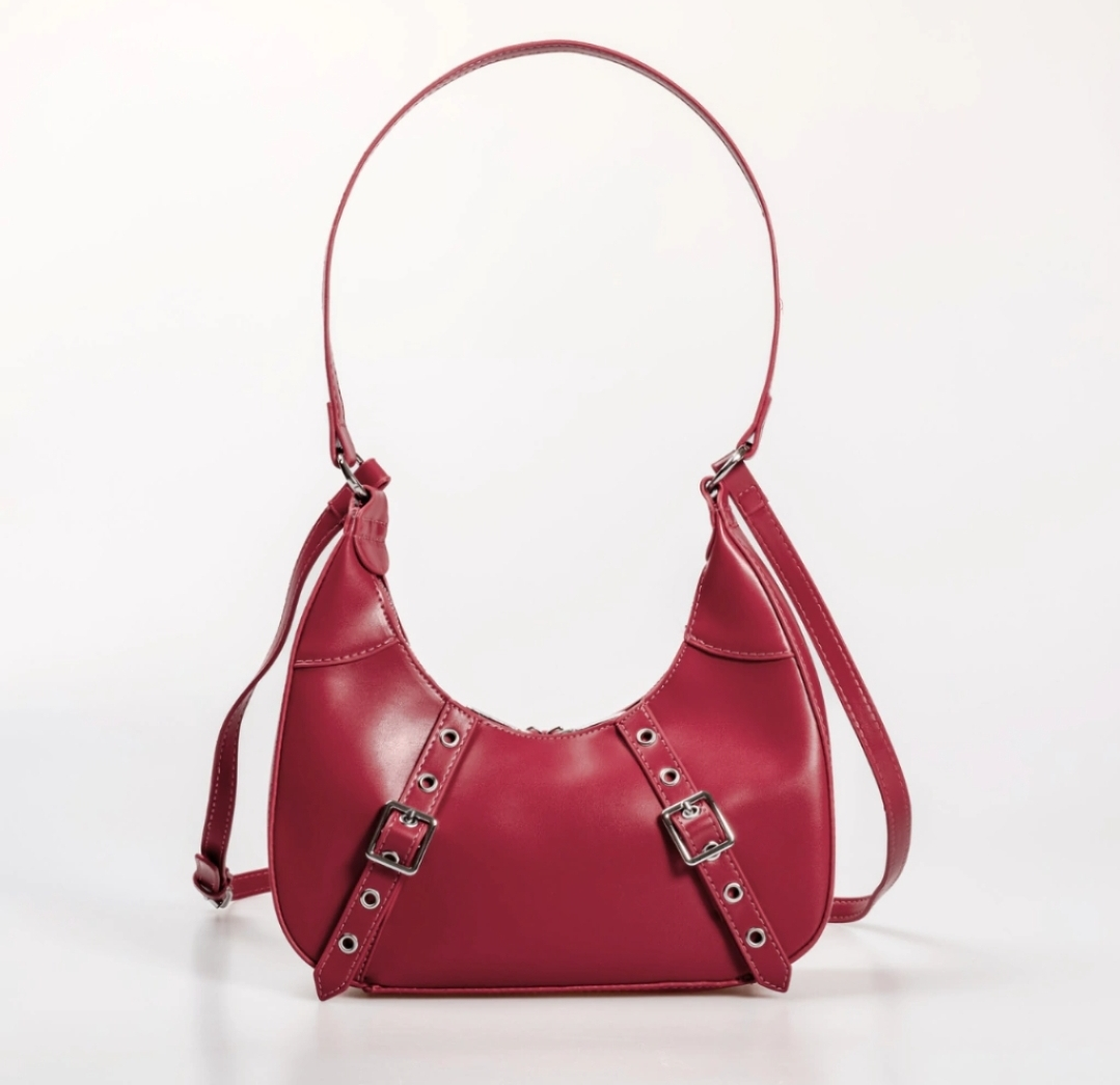 Features: Faux leather exterior, textile lining, silver-tone hardware, magnetic snap closure, one interior slip pocket, and double buckle detail.