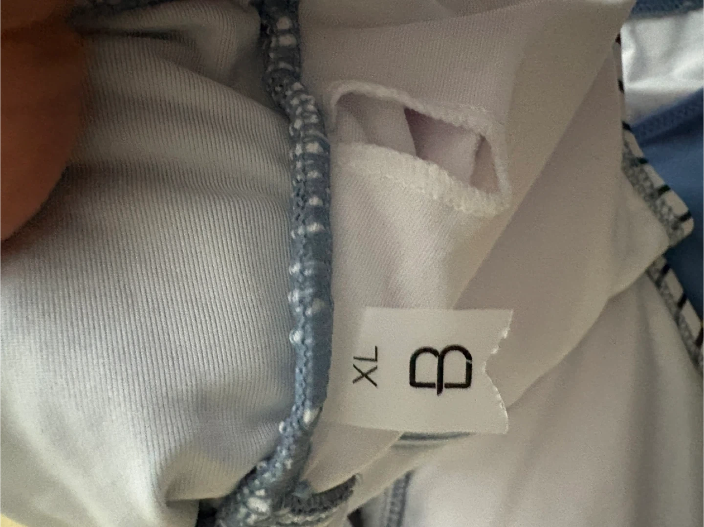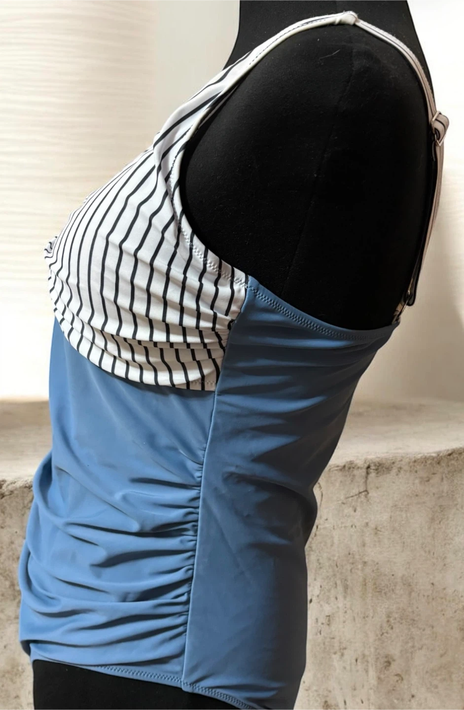 This women's swimsuit features a blue and white striped pattern on the top and solid blue ruching on the bottom. It has adjustable straps and a metal detail at the bust. Size is XL.
