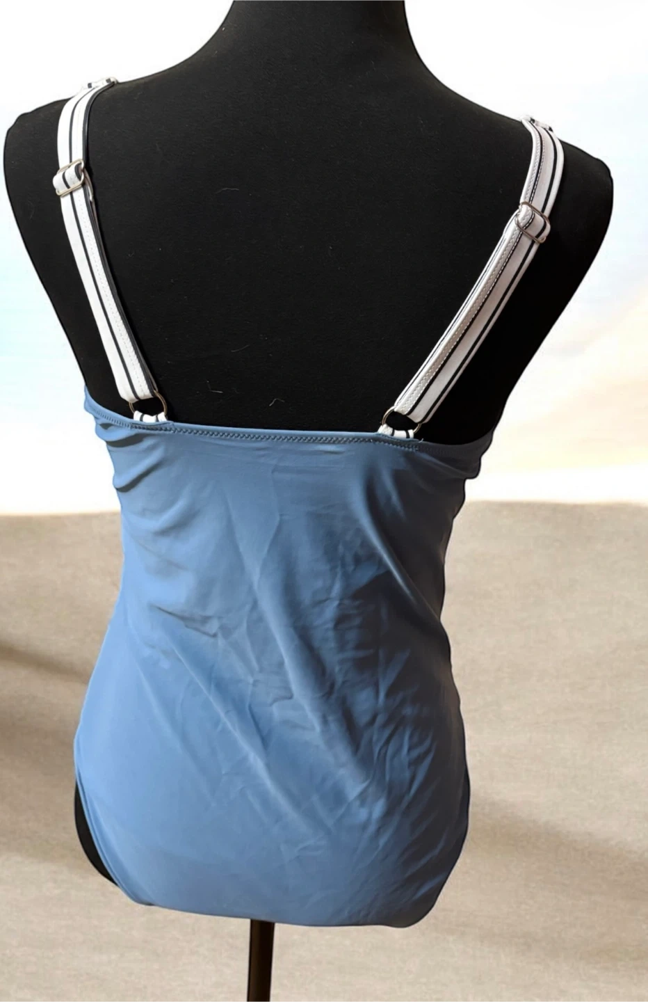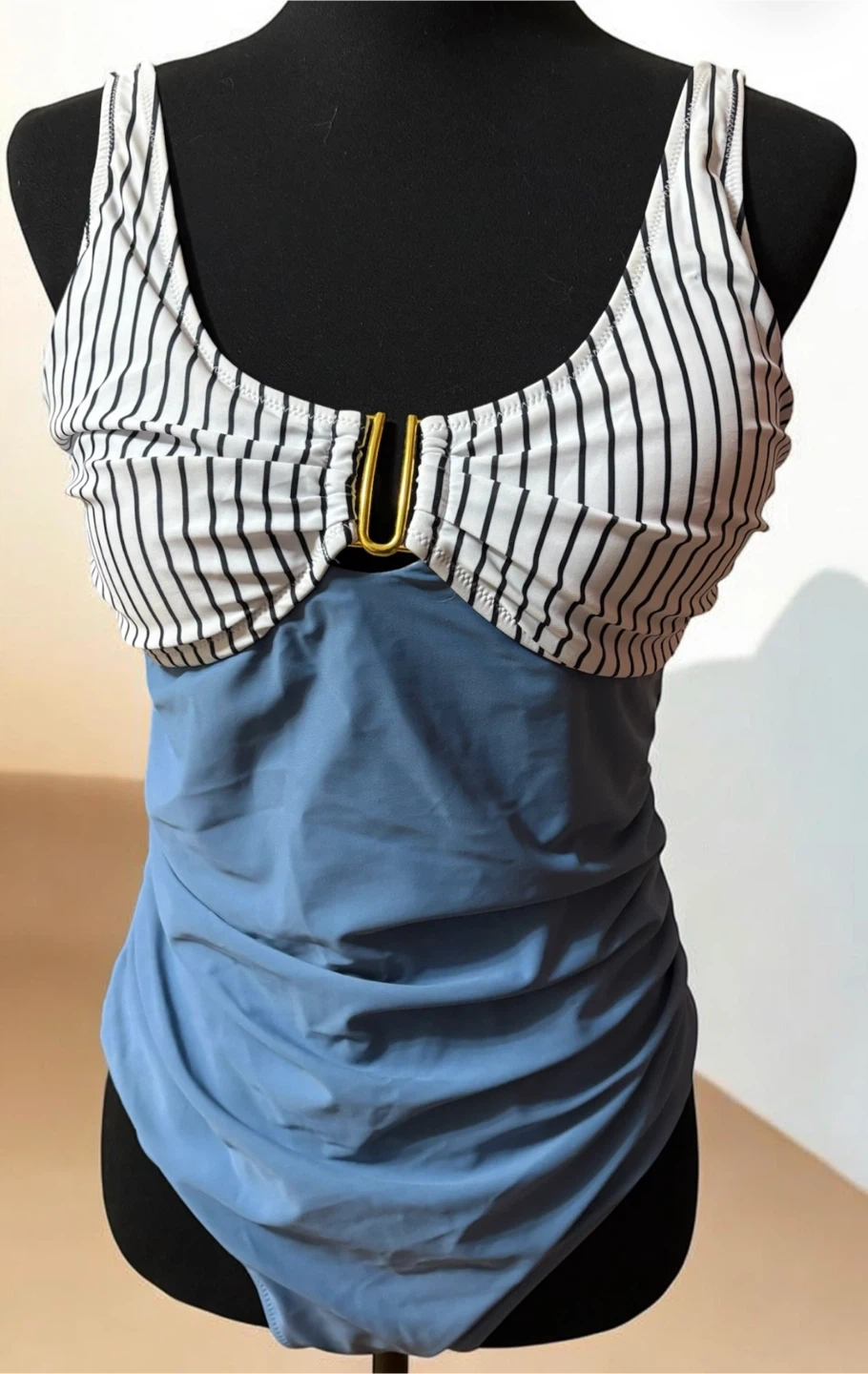This women's swimsuit features a blue and white striped pattern on the top and solid blue ruching on the bottom. It has adjustable straps and a metal detail at the bust. Size is XL.