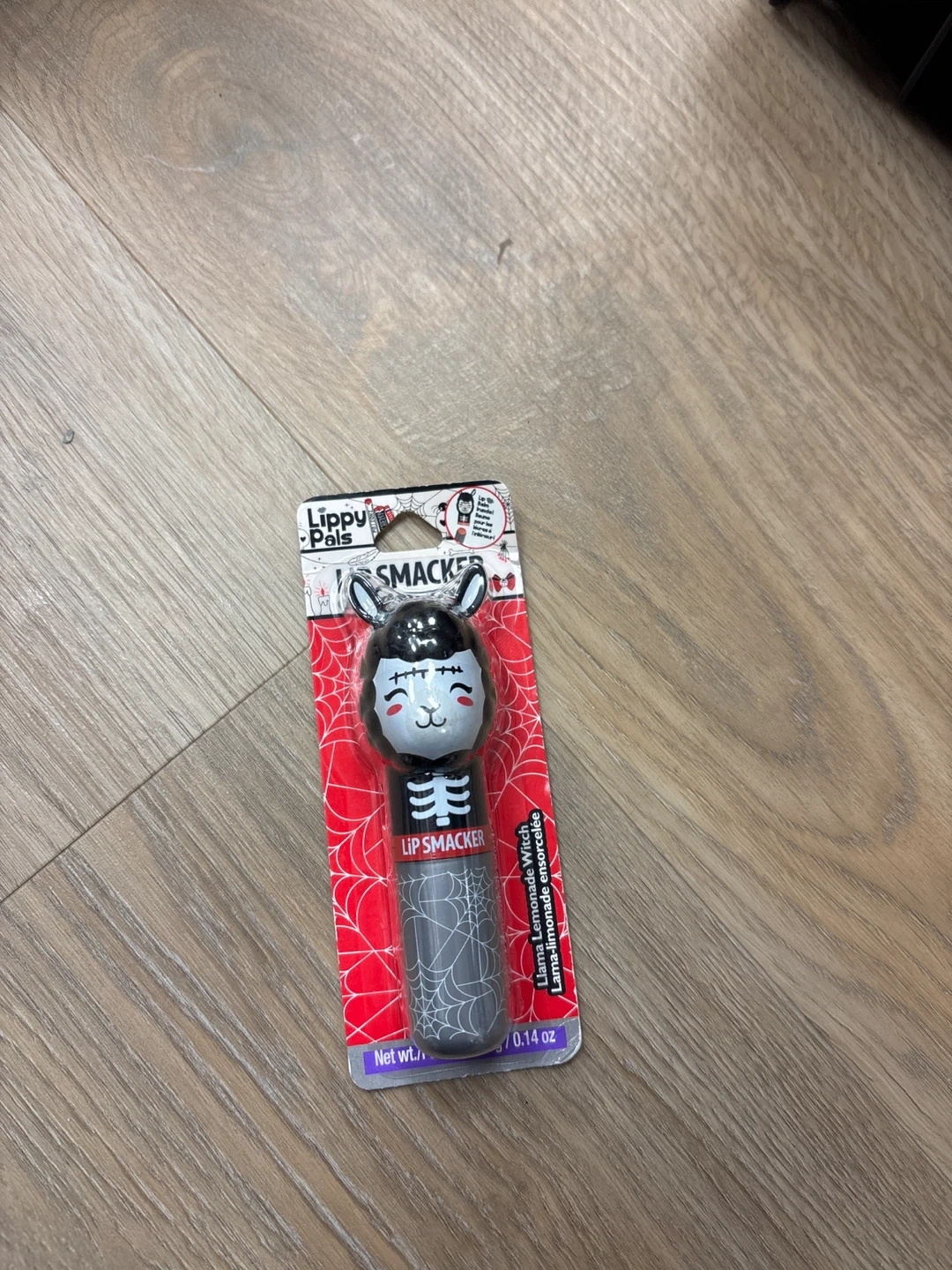 This is a Lip Smacker Llama Lemonade Witch lip balm. It's in its original packaging and contains 0.14 oz. The design is a llama in a witch costume with a skeleton body.