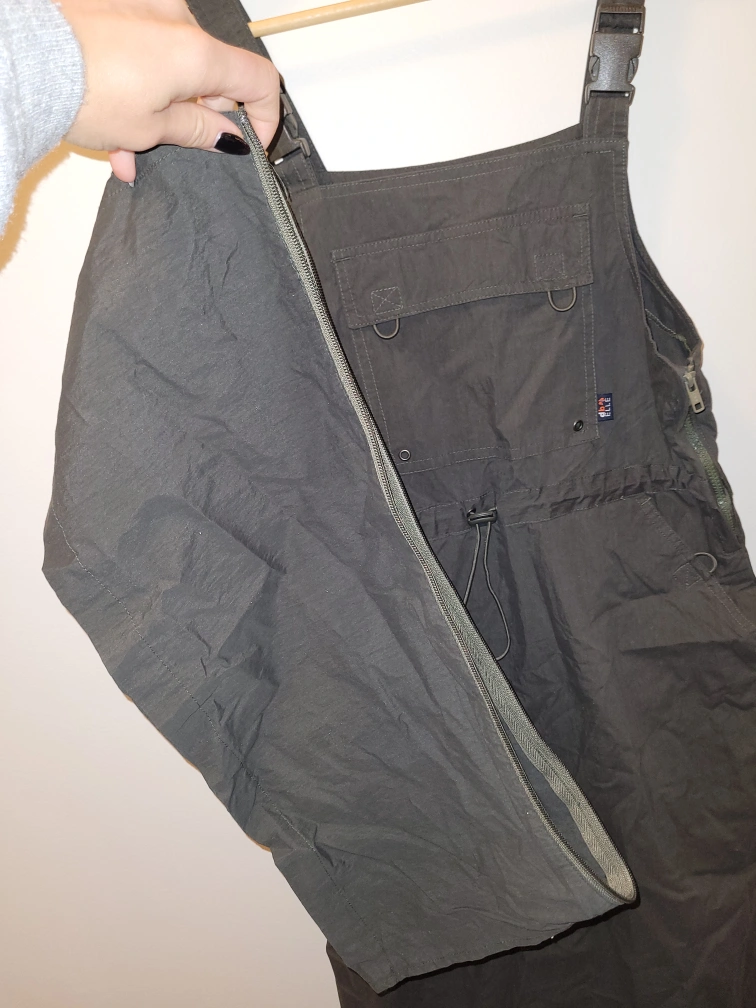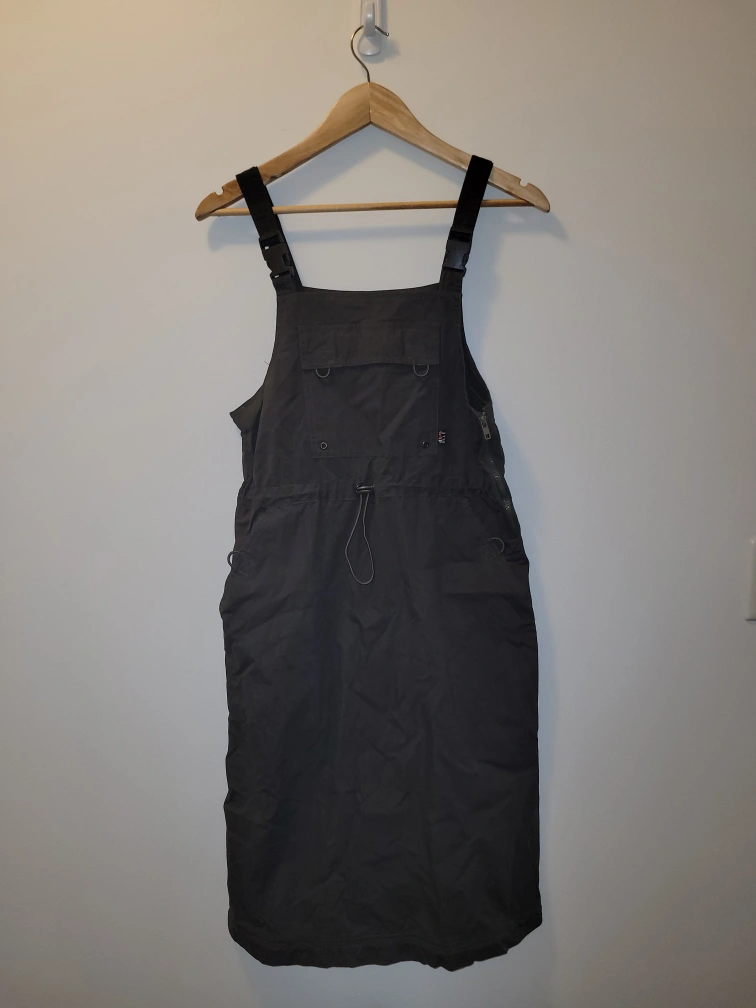 This is a super cool army green overall dress that's just a bit too big for me. Worn once, like-new condition. It's extra cool because you can wear it longer or shorter, with a detachable length you can zip on or off. Wow, what an innovation!