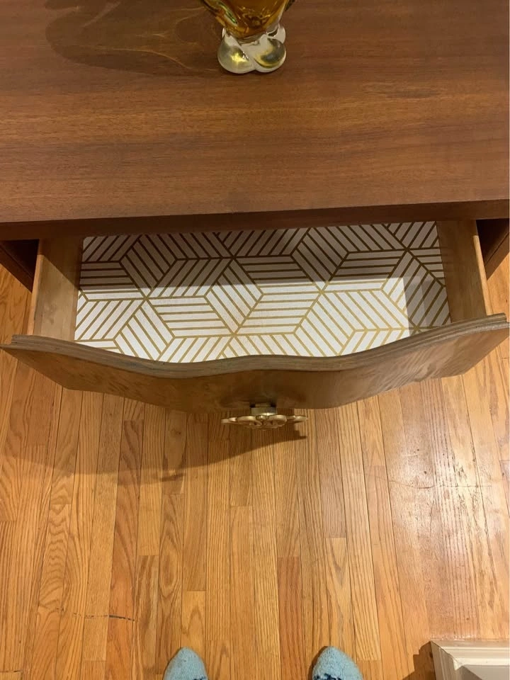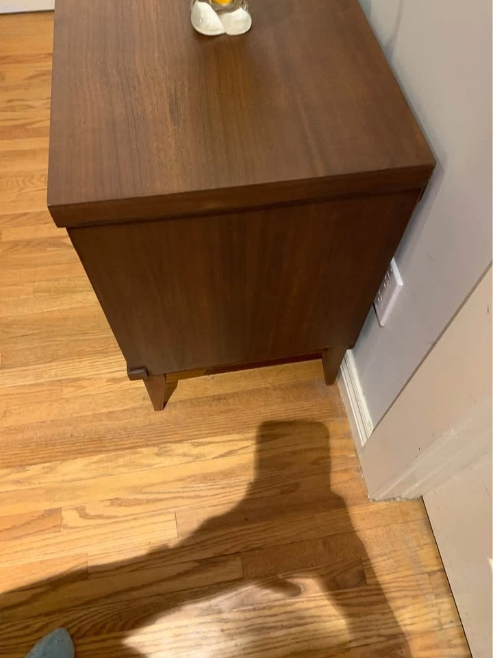 Beautifully refinished classic Mid-Century Modern (MCM) walnut nightstand, likely dating from the 1950s or 60s. It features characteristic MCM design elements, including tapered "stiletto" legs and a distinctive bowed drawer front adorned with an ornate brass floral-sunburst pull that spans both drawers. Top coated for full protection. Dimensions: Width-24”, Height-25”, Depth-16”. Pick up in Brampton L6T 2S6.