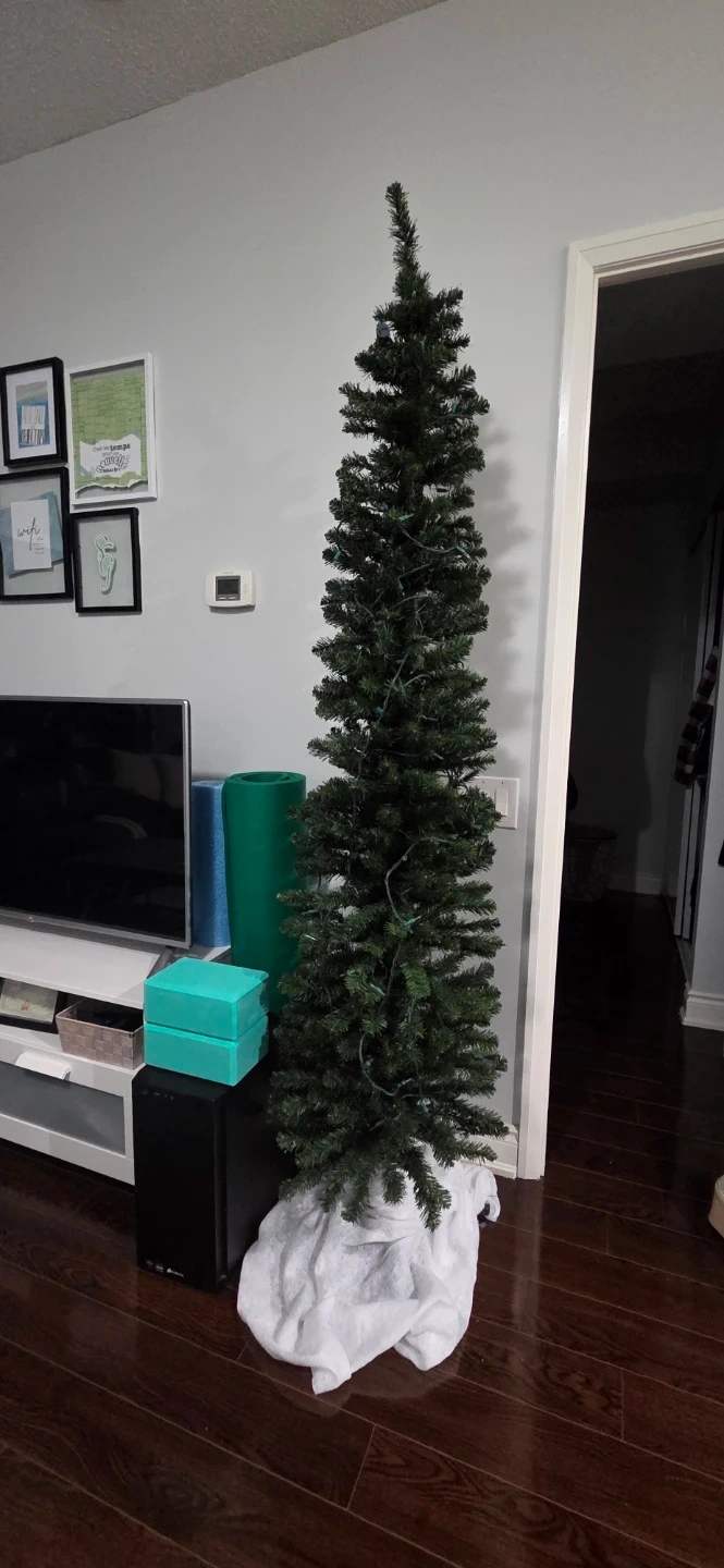 This is a pre-lit artificial Christmas tree. It's a slim design, perfect for smaller spaces. The lights are, unfortunately, out but I bought some string lights to put on. If anyone wants a free tree, it's yours!