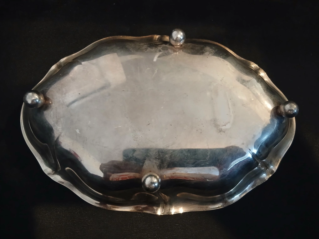 A lovely vintage serving tray with a scalloped edge. It's made of silver-plated metal and has four small ball feet. Perfect for serving appetizers or desserts!