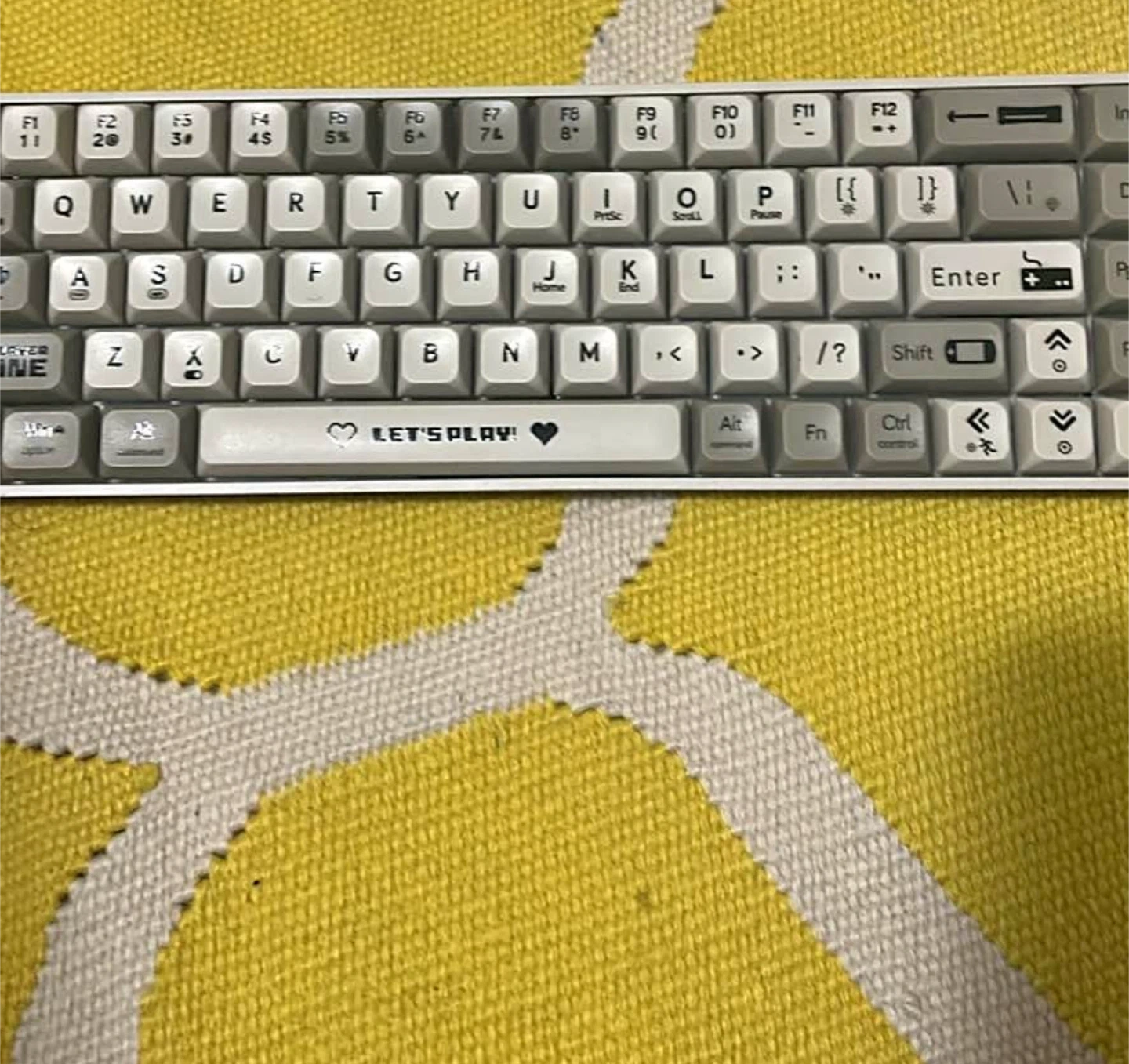 Compact mechanical keyboard with customizable keycaps. It features a white and gray design and a dedicated "LET'S PLAY!" spacebar. Great for gamers!