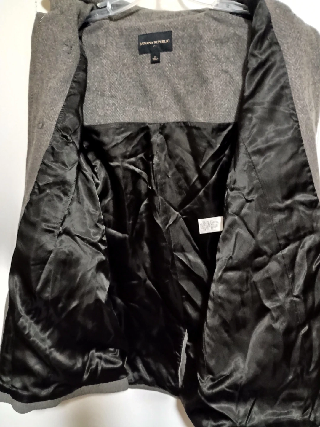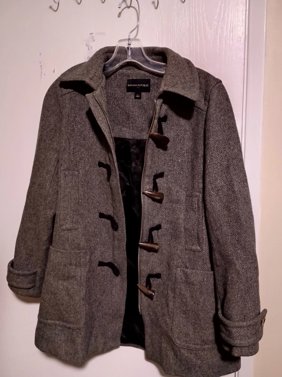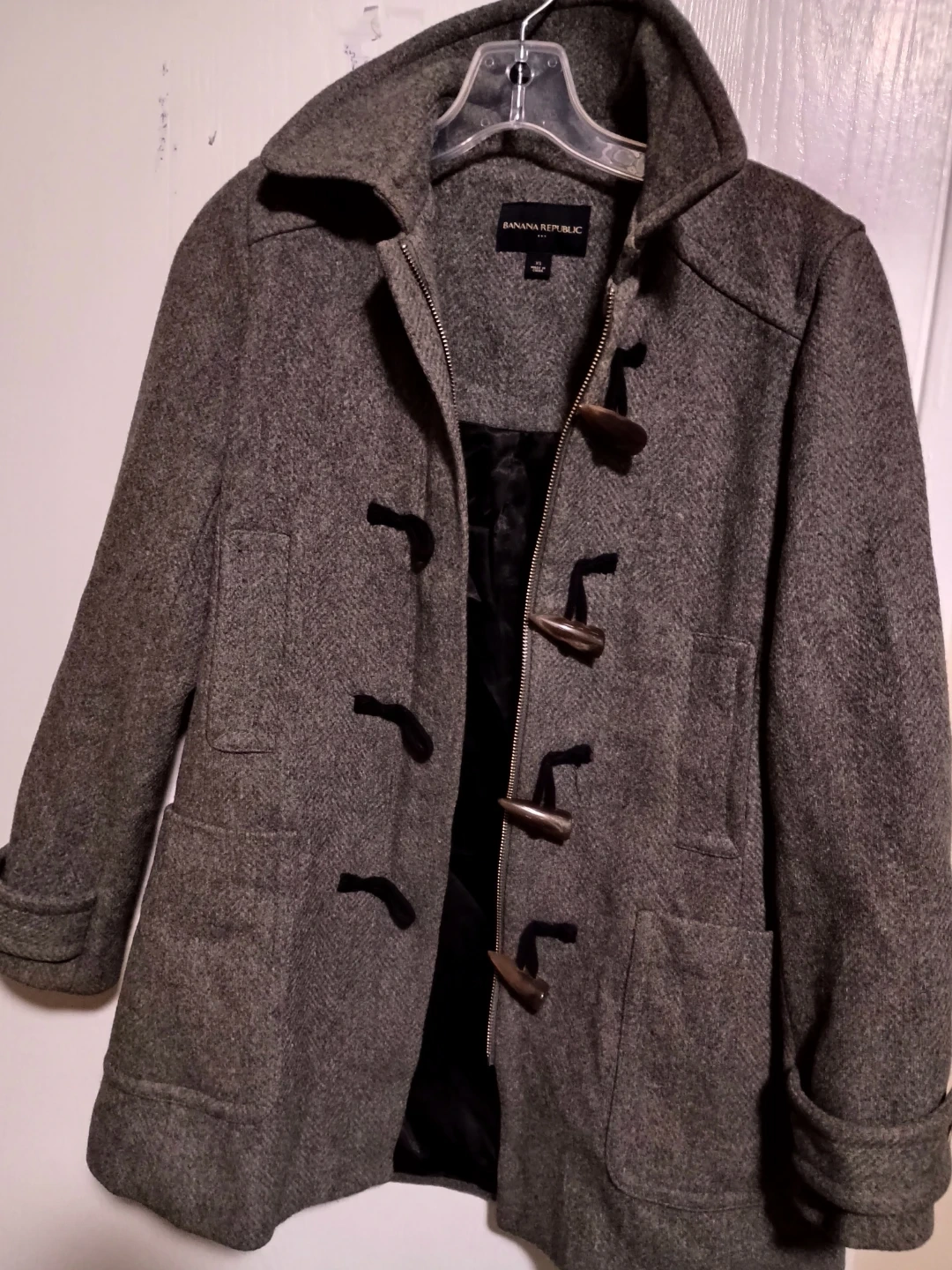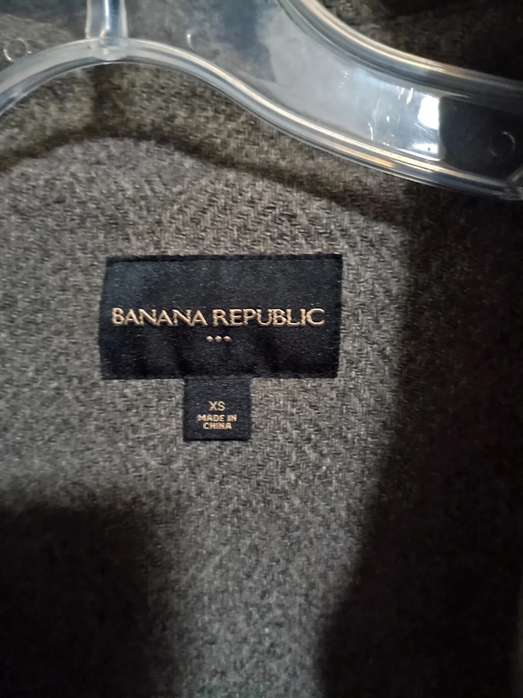 Selling a gently used Banana Republic duffle coat in size XS. It's a stylish and cozy coat perfect for cooler weather. The outer shell is made of 62% wool, 37% viscose, and 1% other fiber, while the lining is 100% acetate. It features a classic duffle coat design with toggle closures and a hood.