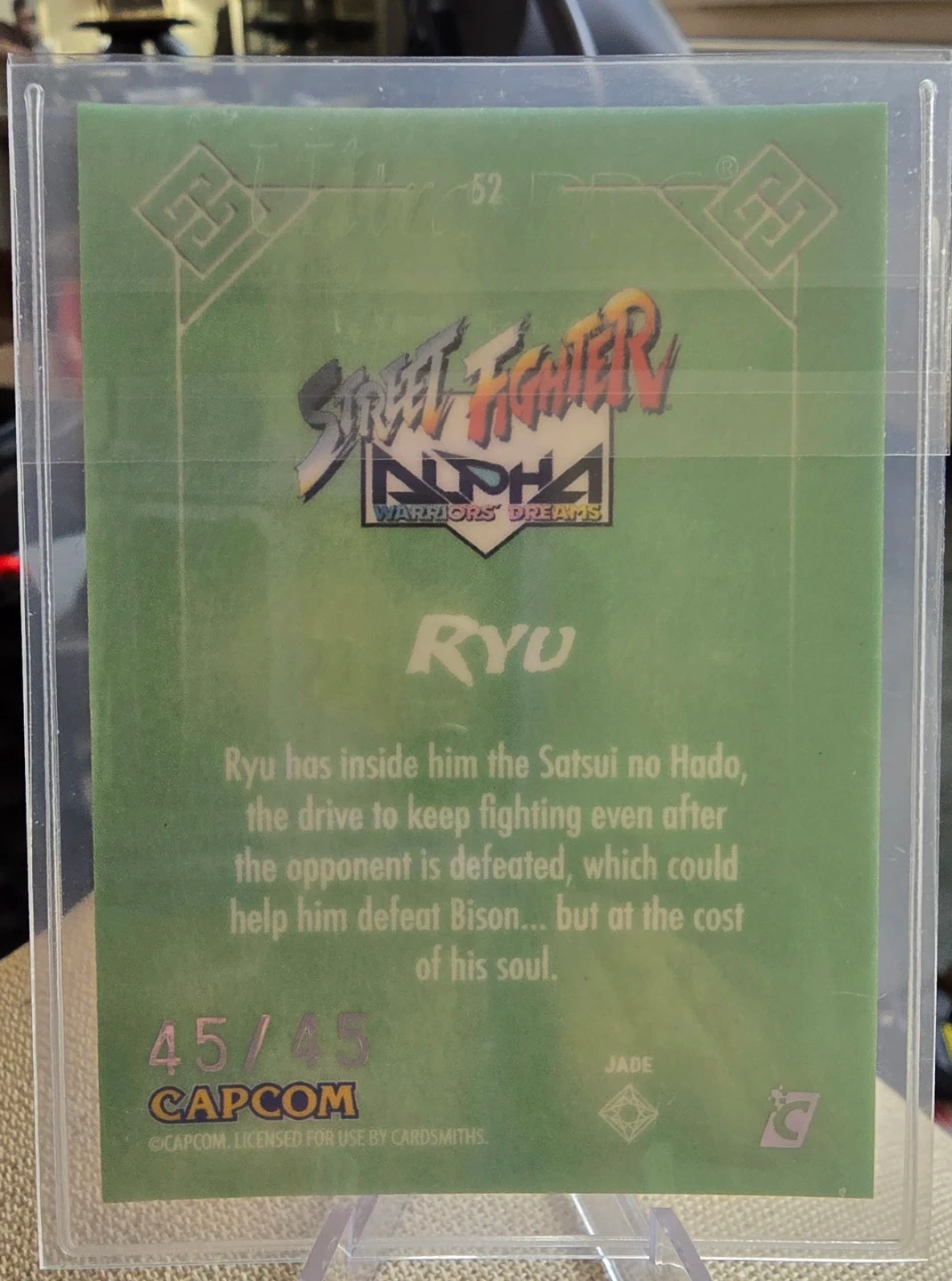 This is a Street Fighter Alpha Warriors Dreams trading card featuring Ryu. The card is numbered 45 out of 45 and is from Capcom. It's in protective casing. RARE OMEGA NUMBER