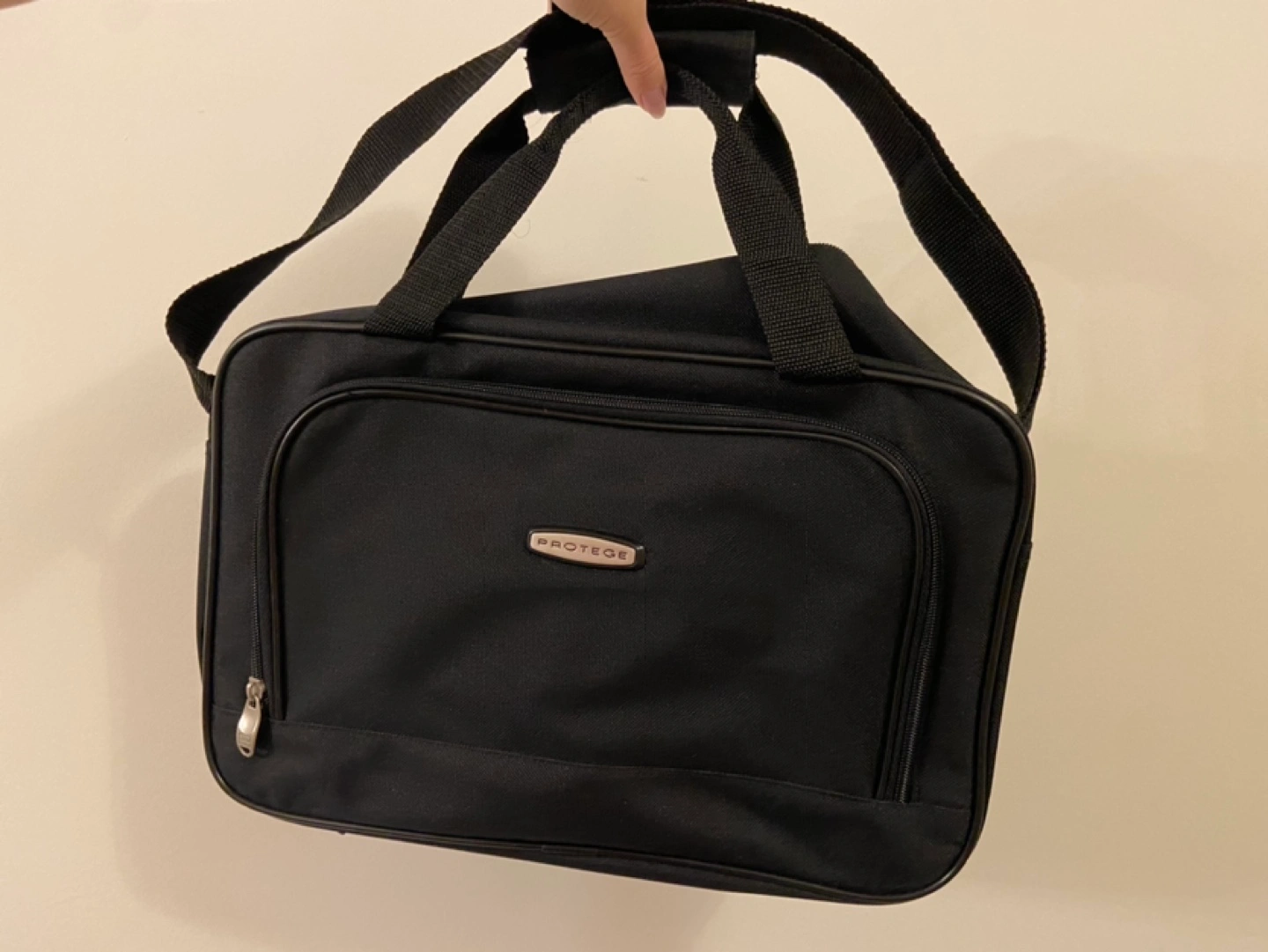 Black carry-on travel or laptop bag. Features top handles and a shoulder strap. Multiple zippered compartments. Ideal for weekend trips or short getaways.