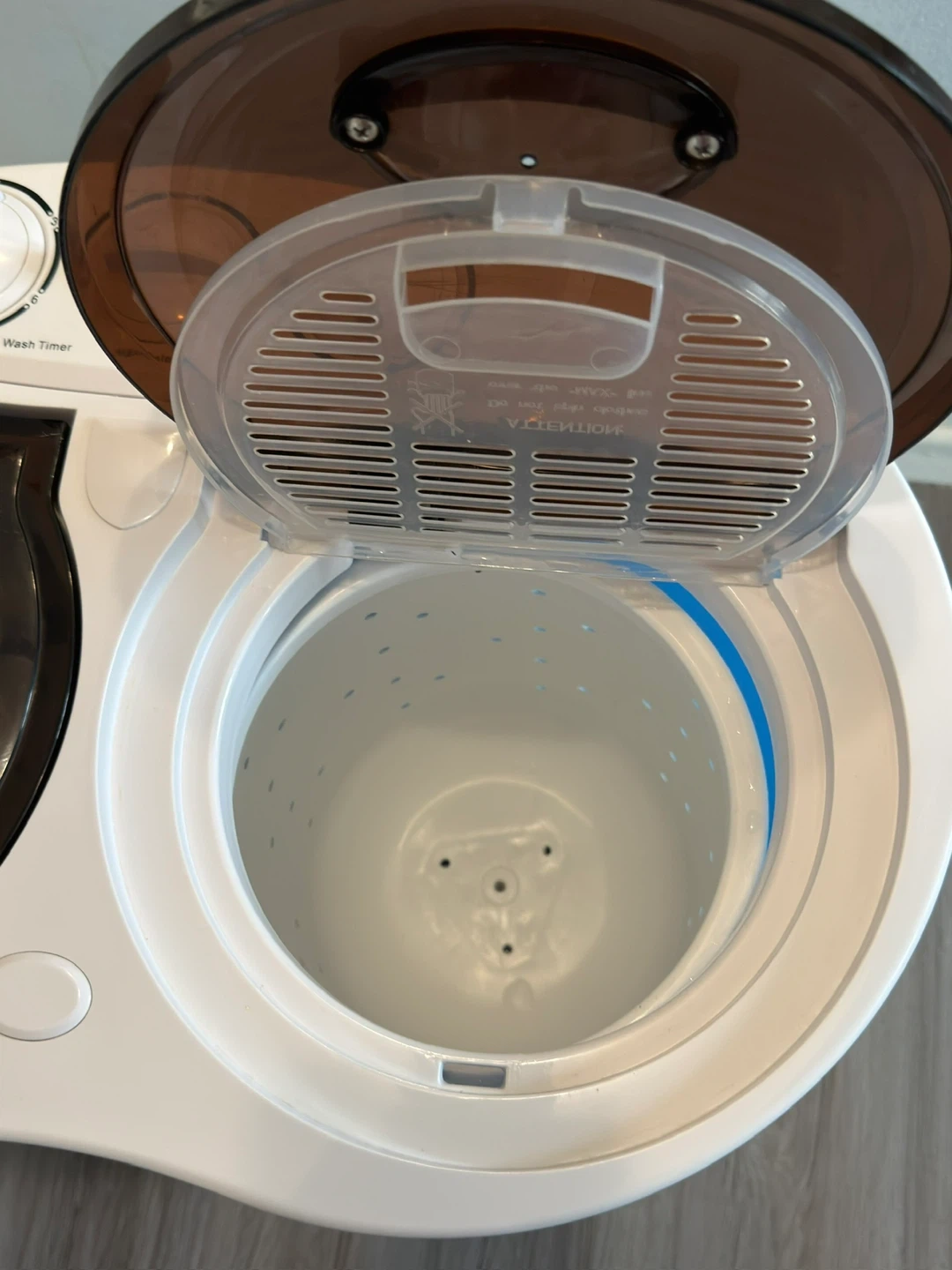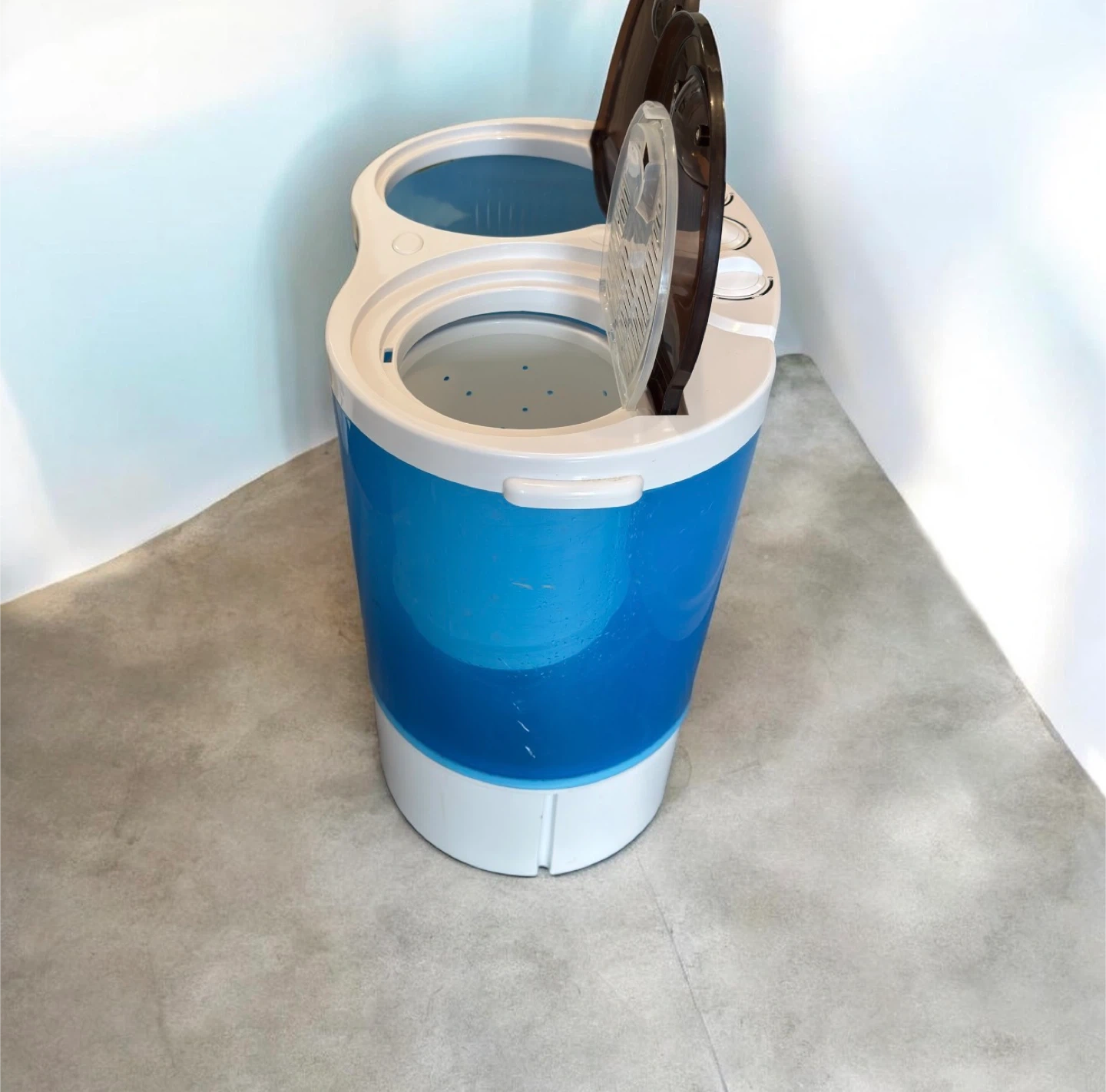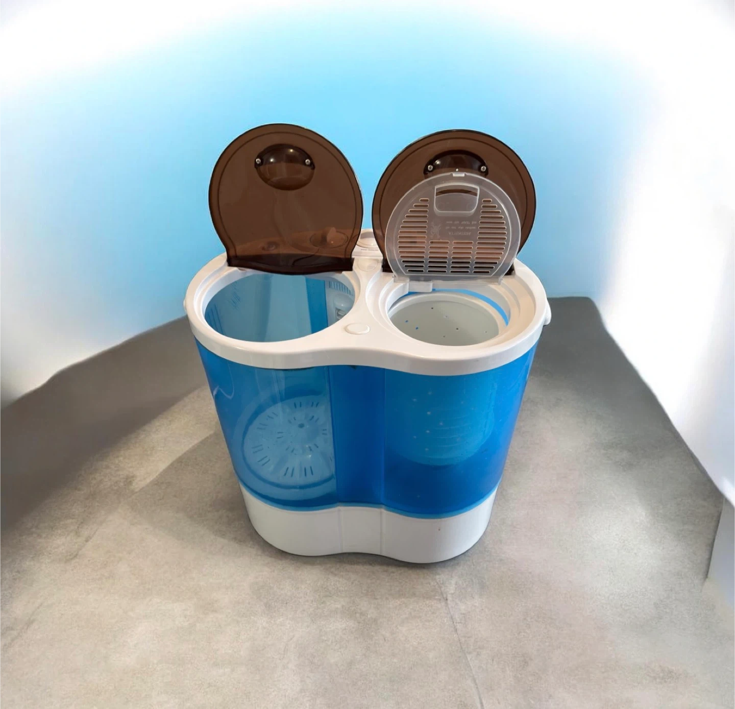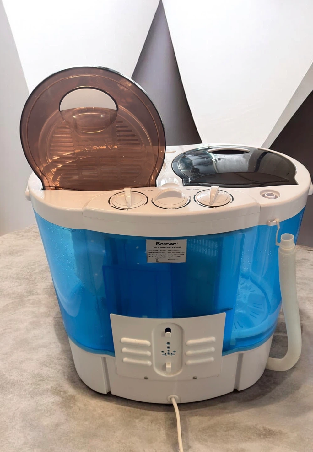 This compact mini twin-tub washing machine is gently used, in great condition, and has been well maintained. It is capable of washing and spinning effectively. It enables you to wash and spin dry at the same time or separately, using individual timers. Its lightweight, rust-resistant plastic body and clear design make it simple to transport and monitor. It's easy to use and takes up little space, making it ideal for dorms, apartments, RVs, and travel.