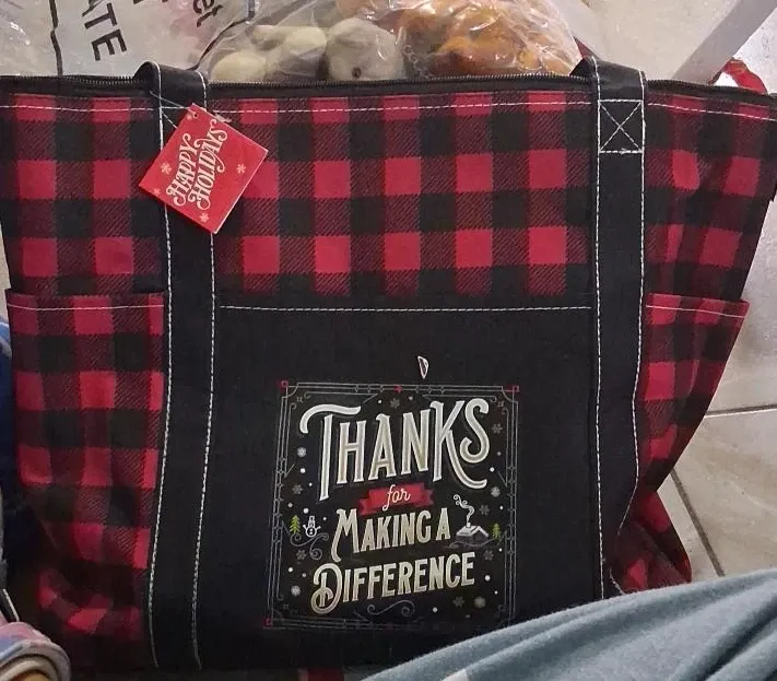 I'm selling a cute tote bag with a red and black plaid pattern. It features a front design that says, "Thanks for Making a Difference"! It's perfect for carrying groceries, books, or anything else you need