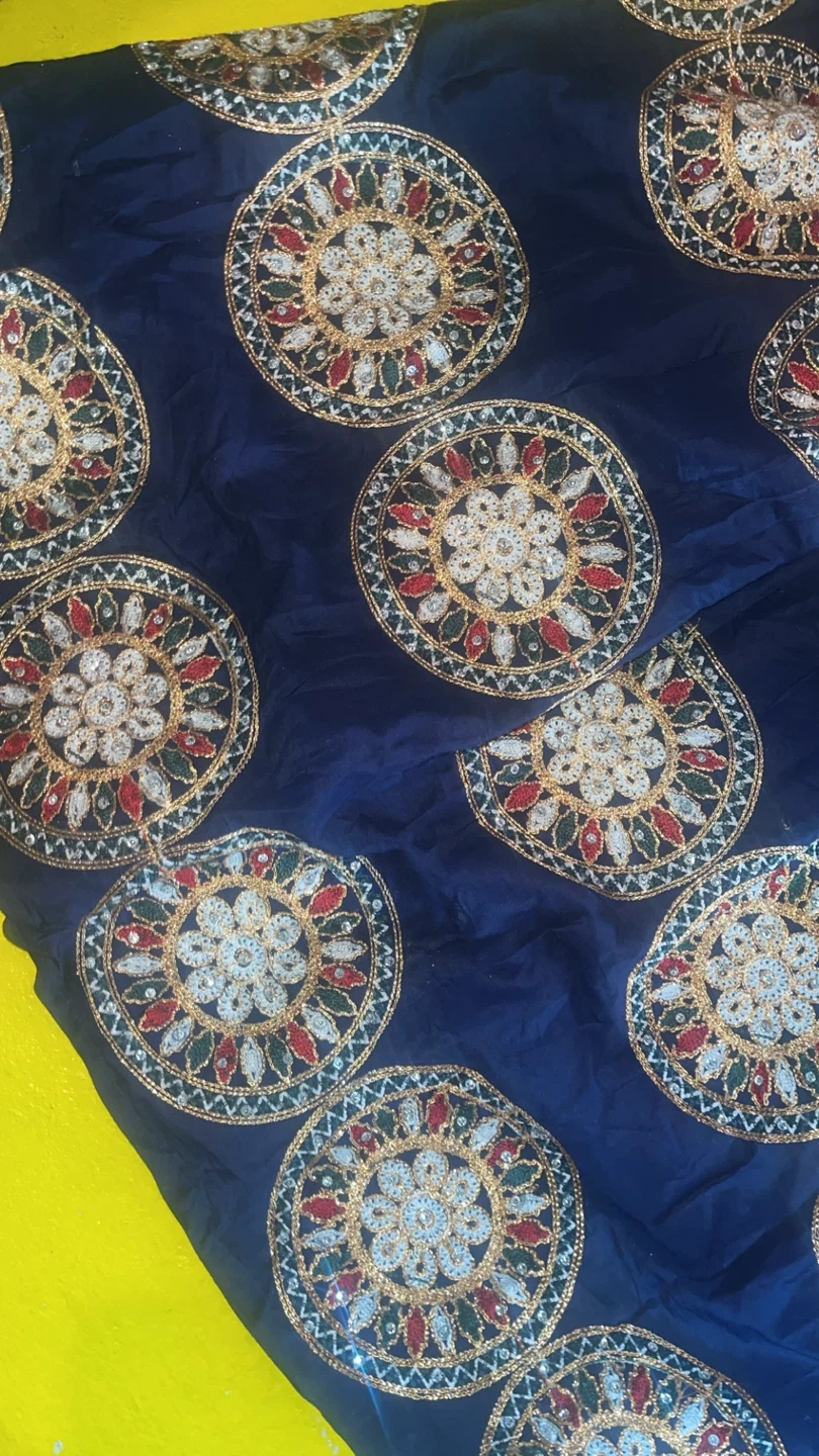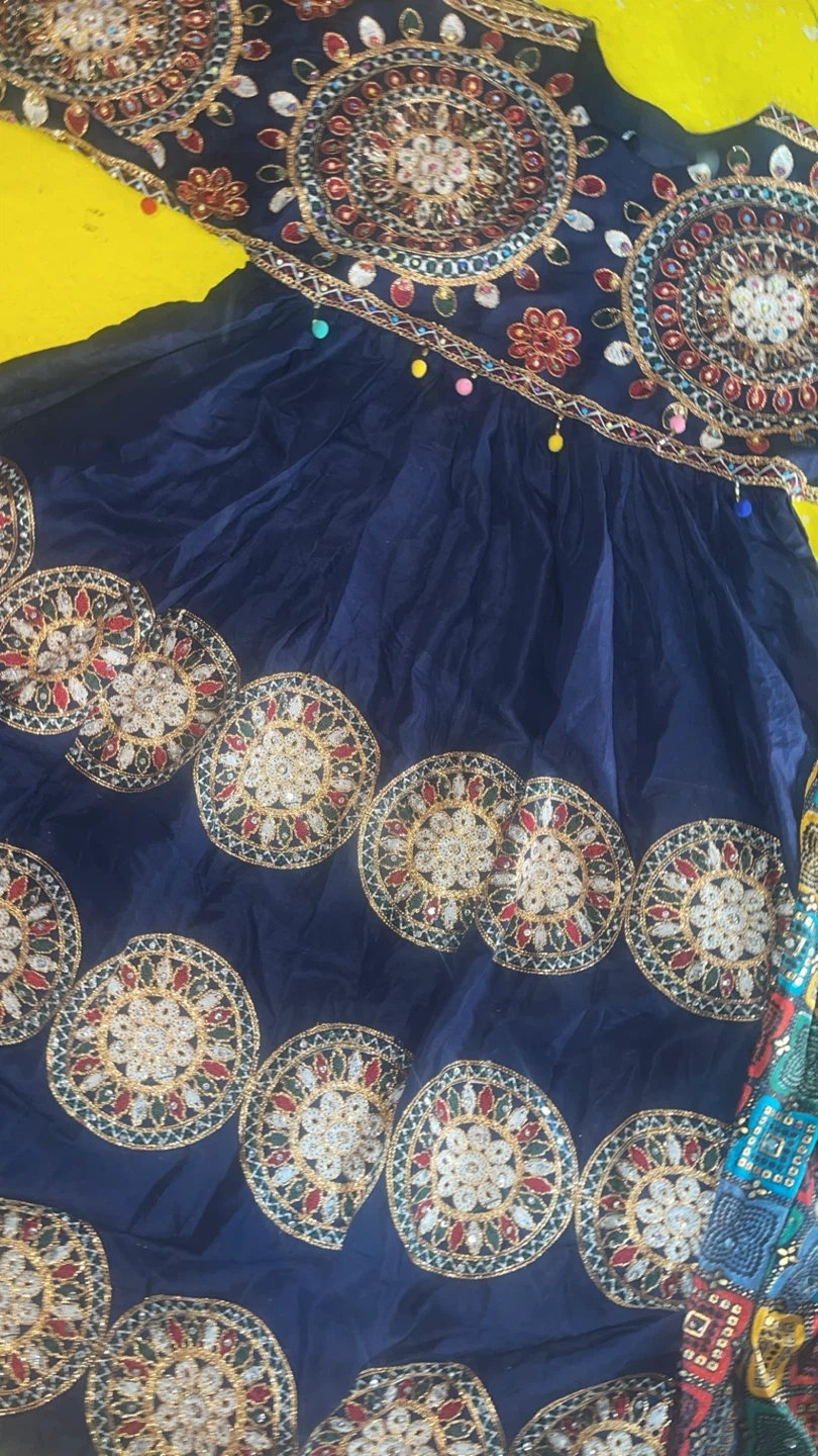 Navy blue dress featuring intricate mandala-style embroidery with gold, red, and green thread. Accented with small colourful pom-poms along the hem. Fabric appears to be a smooth, perhaps satin-like material. It's a beautiful piece with lots of detail!