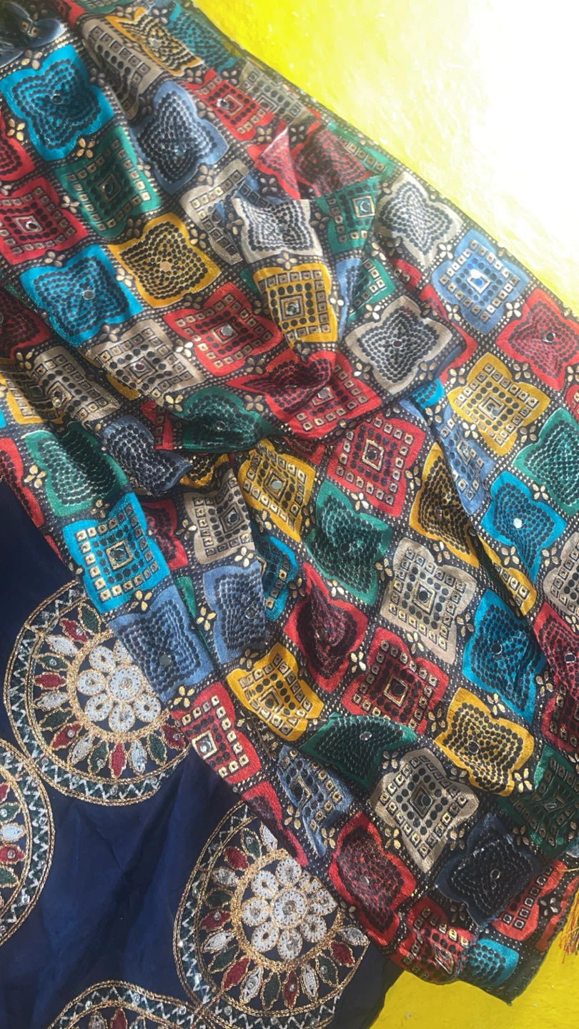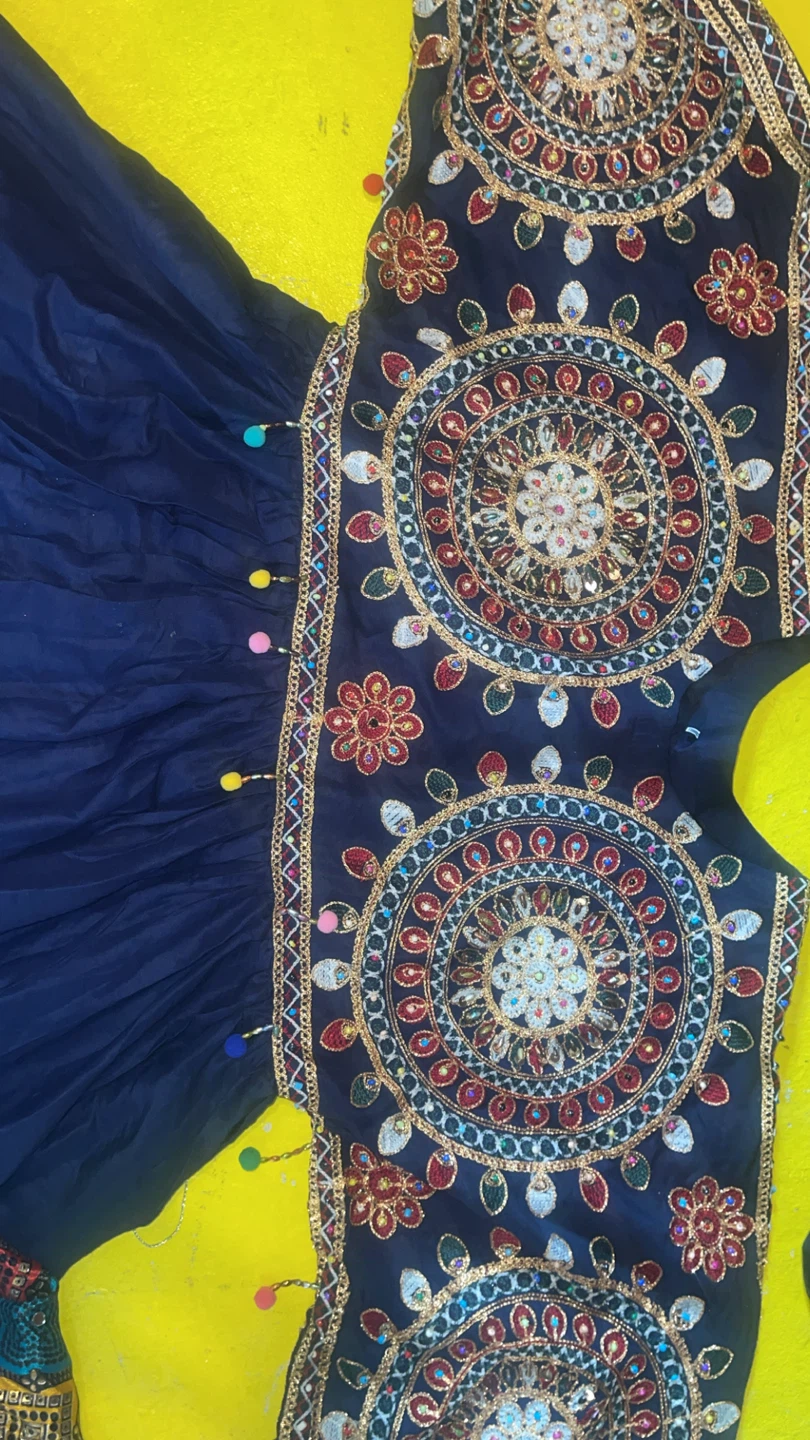 Navy blue dress featuring intricate mandala-style embroidery with gold, red, and green thread. Accented with small colourful pom-poms along the hem. Fabric appears to be a smooth, perhaps satin-like material. It's a beautiful piece with lots of detail!