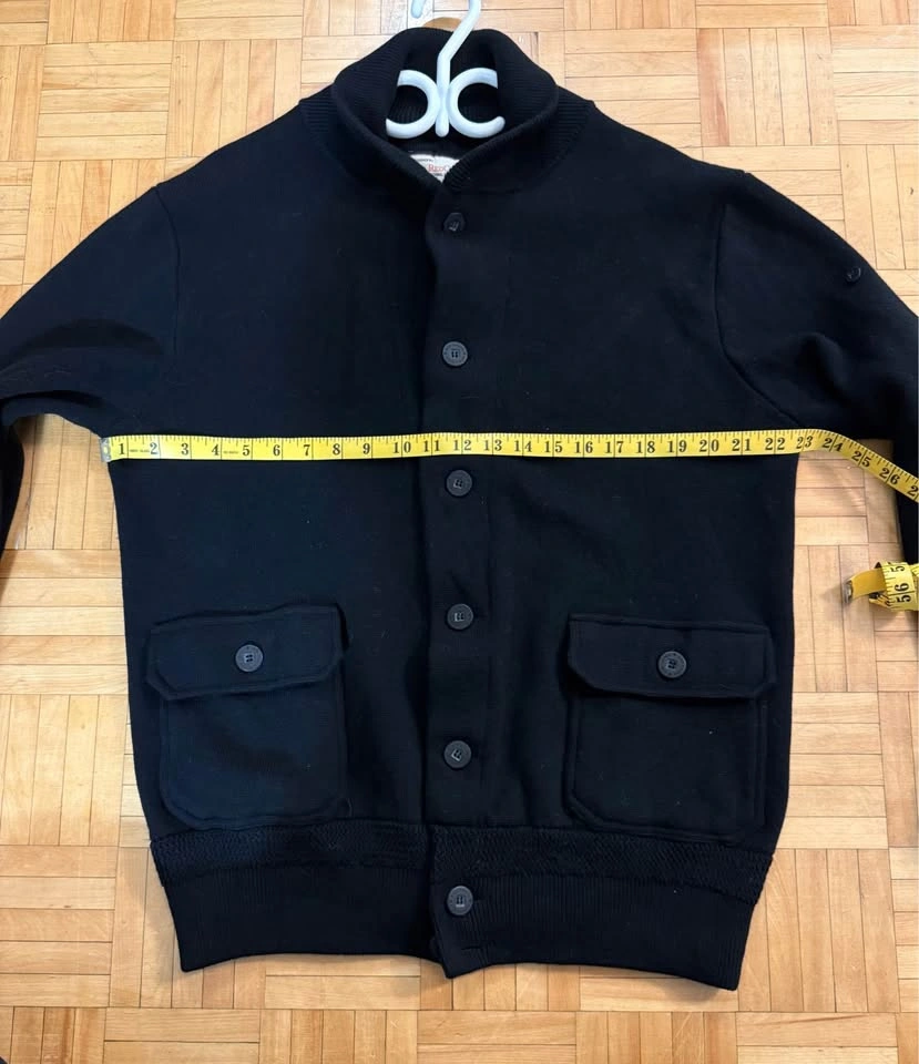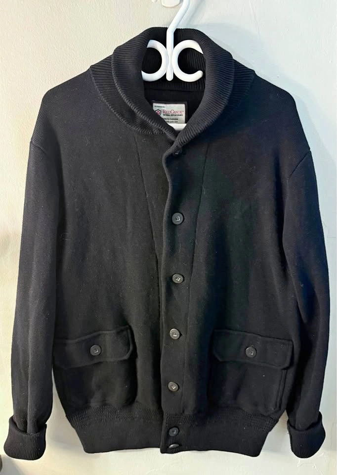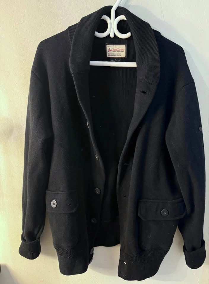 Red Canoe men’s button up cardigan. 100% cotton knit, black, not missing any buttons, elbow patches, very good quality. Missing arm patch (as seen in original brand photos). Excellent like new condition. See measurements in photos (men’s XL) Pick up near Queen St W & John St, or College St & University Ave M-F during working hours. May be able to meet elsewhere or potentially deliver depending on location