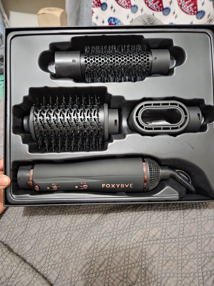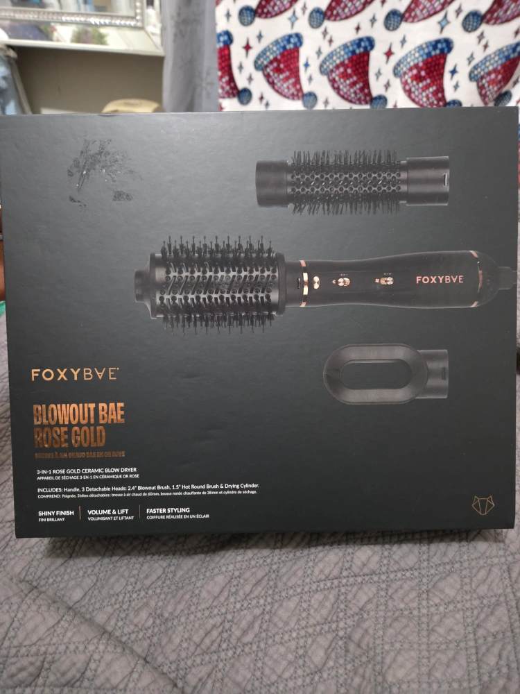 Selling a FOXYBae Blowout Bae 3-in-1 rose gold ceramic blow dryer set! It includes the handle and three detachable heads: a 2.4" blowout brush, a 1.5" hot round brush, and a drying cylinder. It's designed for shiny finishes, volume and lift, and faster styling. Comes with the original box!