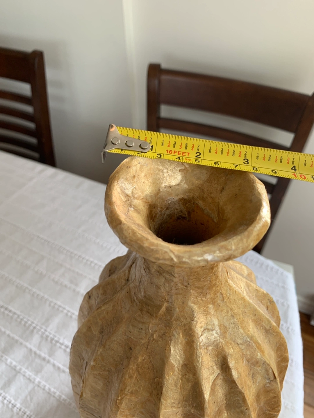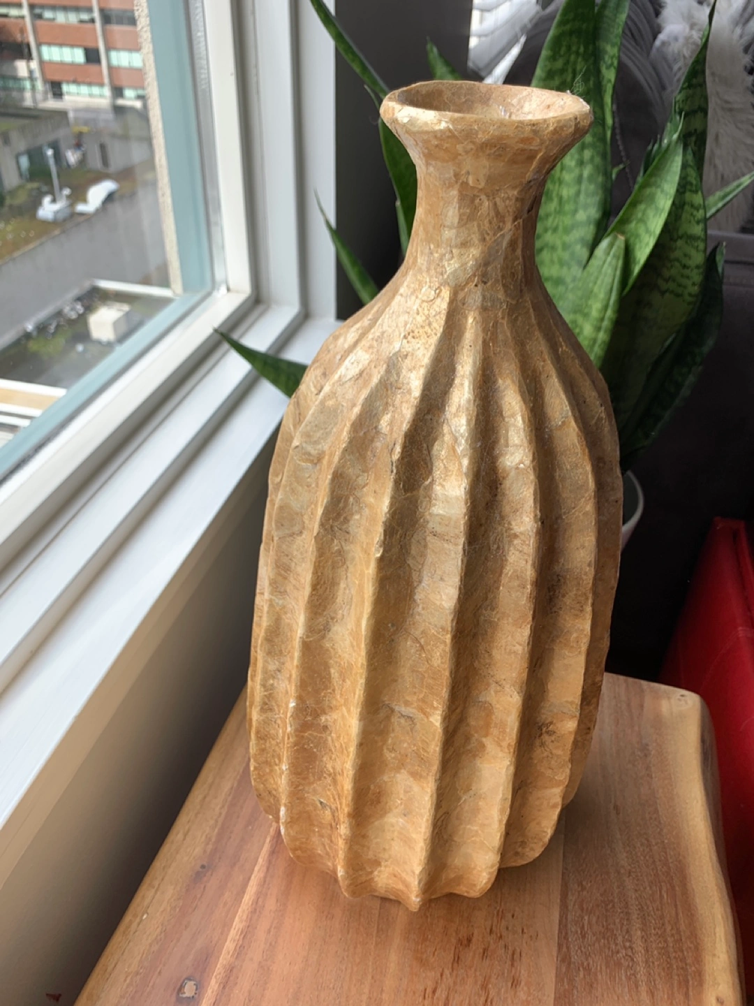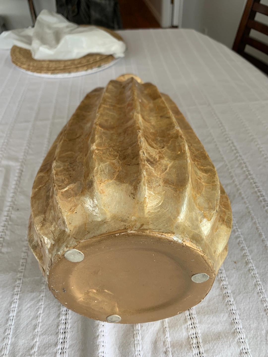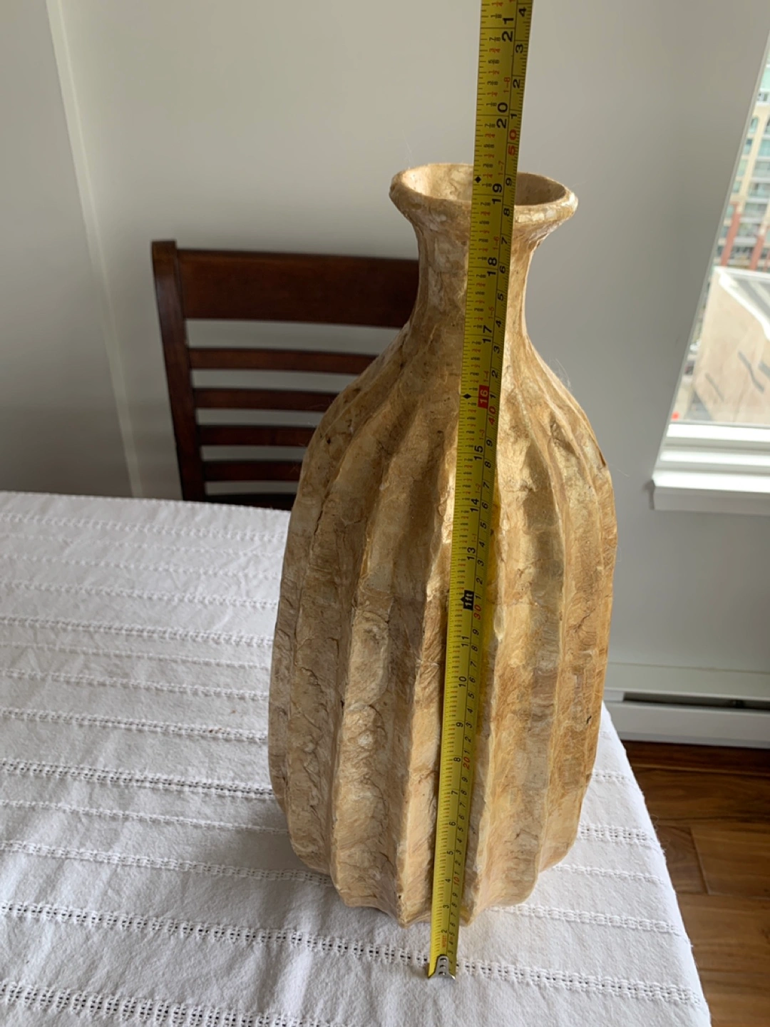 Tall decorative vase. Beige and gold colour. Pleated design. Approximately 18 inches tall. Unique home decor piece.