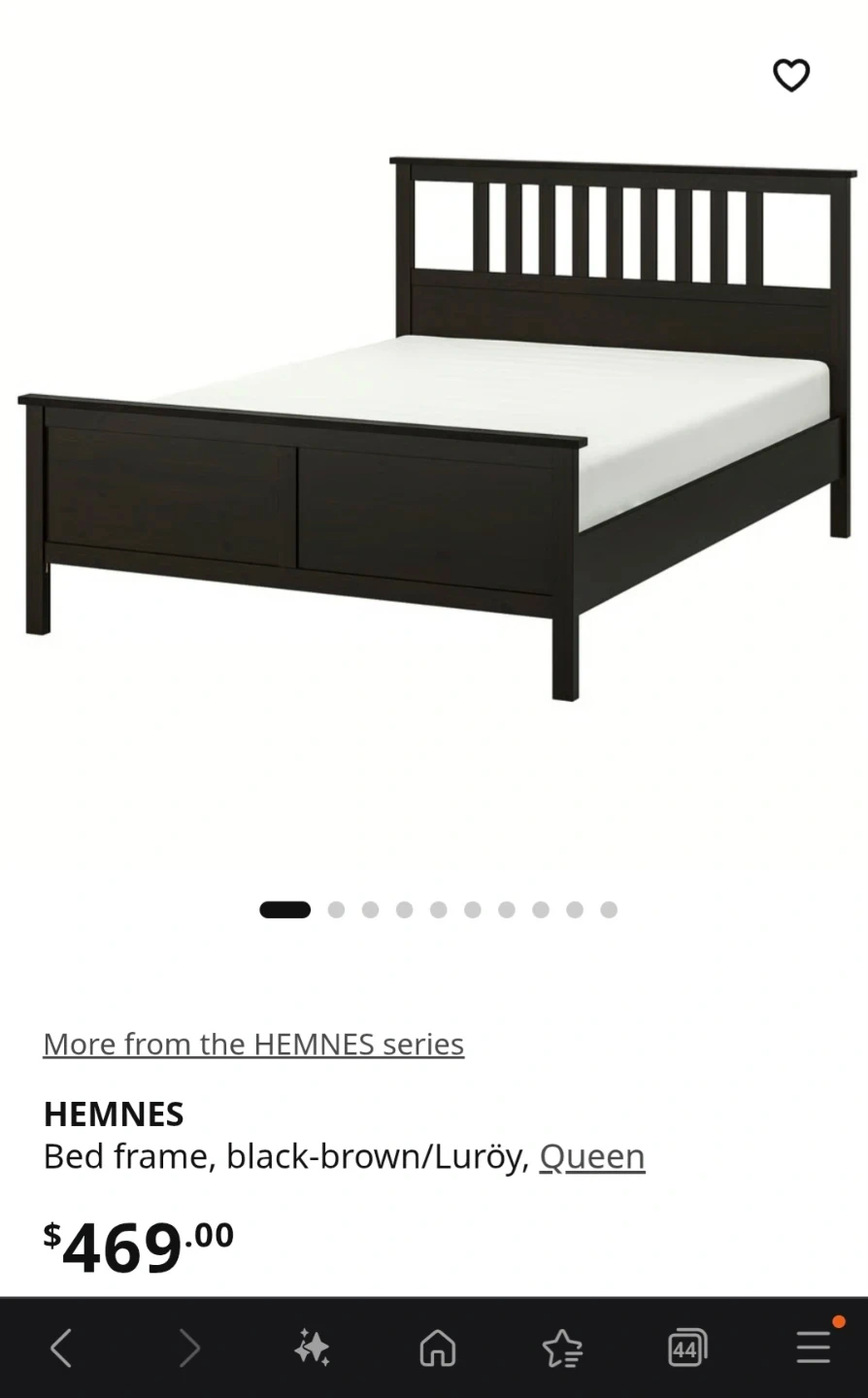 Selling an IKEA HEMNES queen bed frame in black-brown. It's part of the HEMNES series and includes the Luröy slatted bed base. This sturdy bed frame's classic design complements many bedroom styles. Great for anyone looking for a reliable and stylish queen-size.