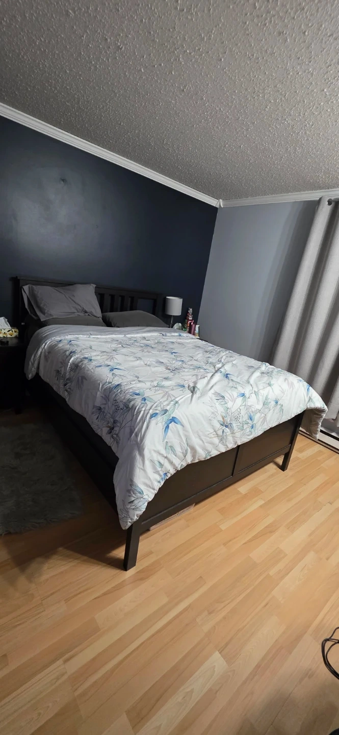 Selling an IKEA HEMNES queen bed frame in black-brown. It's part of the HEMNES series and includes the Luröy slatted bed base. This sturdy bed frame's classic design complements many bedroom styles. Great for anyone looking for a reliable and stylish queen-size.