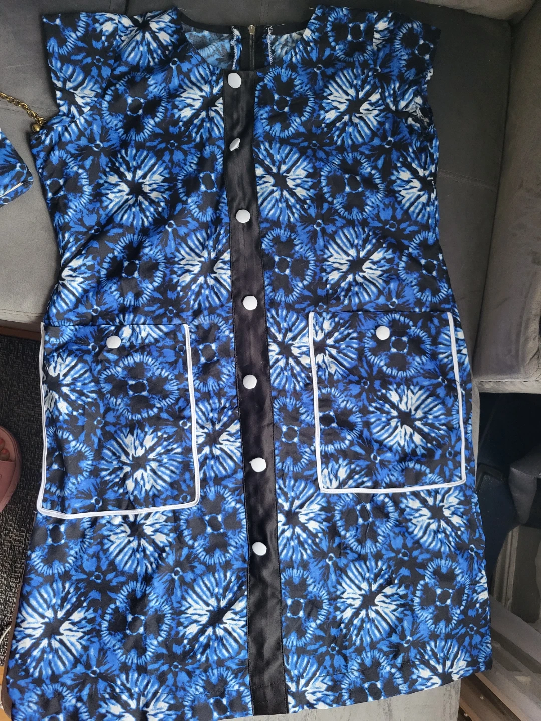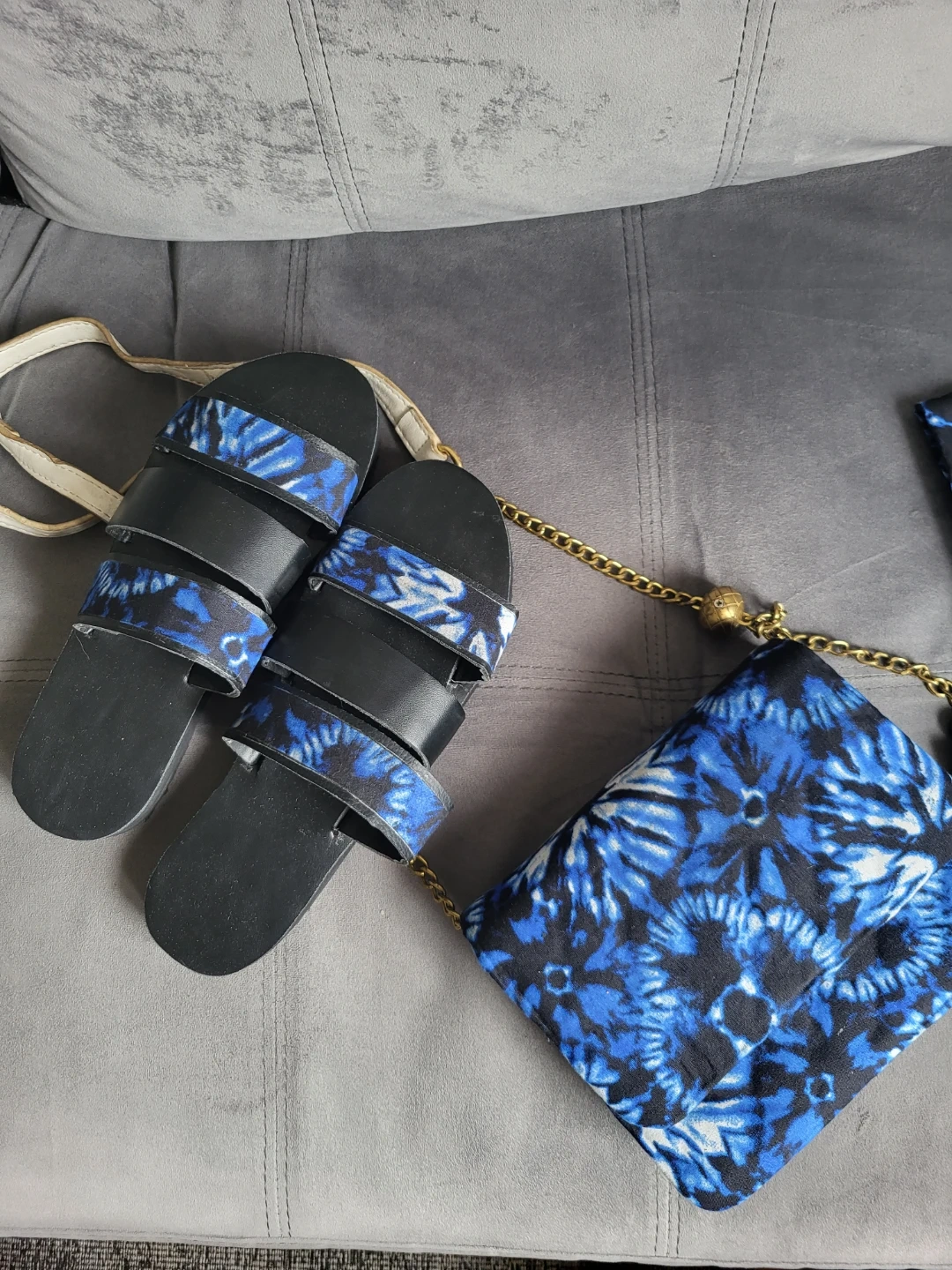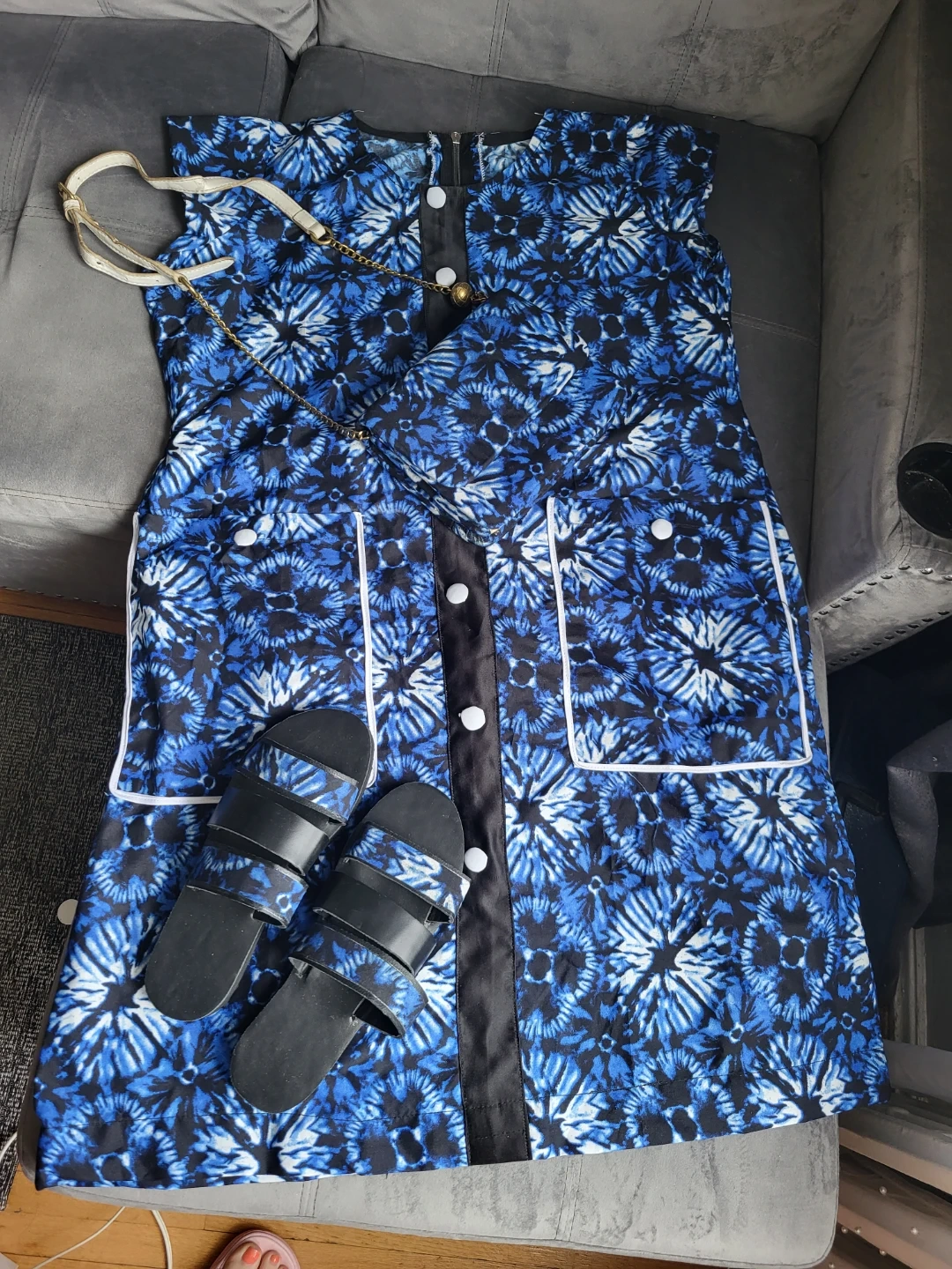 Sleeveless dress featuring a vibrant blue and black tie-dye pattern with white accents. It has a button-up front, two functional pockets, and a zipper closure. Matching flat sandals with black straps and a small clutch bag are also included. The dress has a gold chain detail around the neckline. This set is perfect for a casual outing or a tropical getaway!