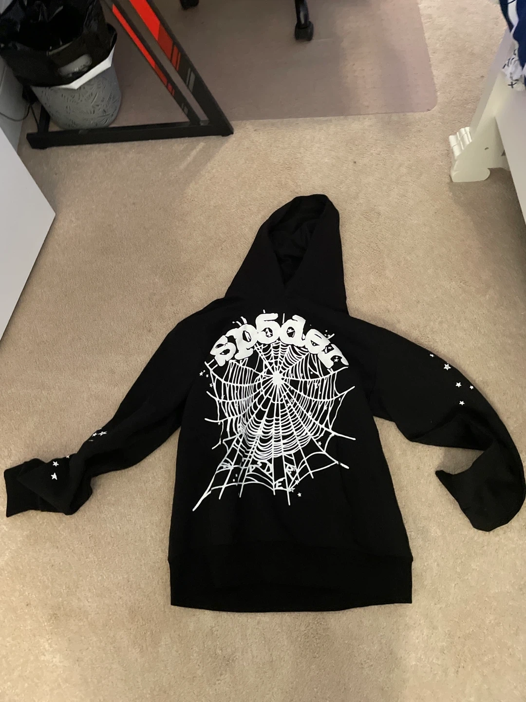 Black Sp5der hoodie featuring a white spiderweb graphic on the back and stars on the sleeves. It's a pullover style with a hood. Black colour. Cotton blend material.