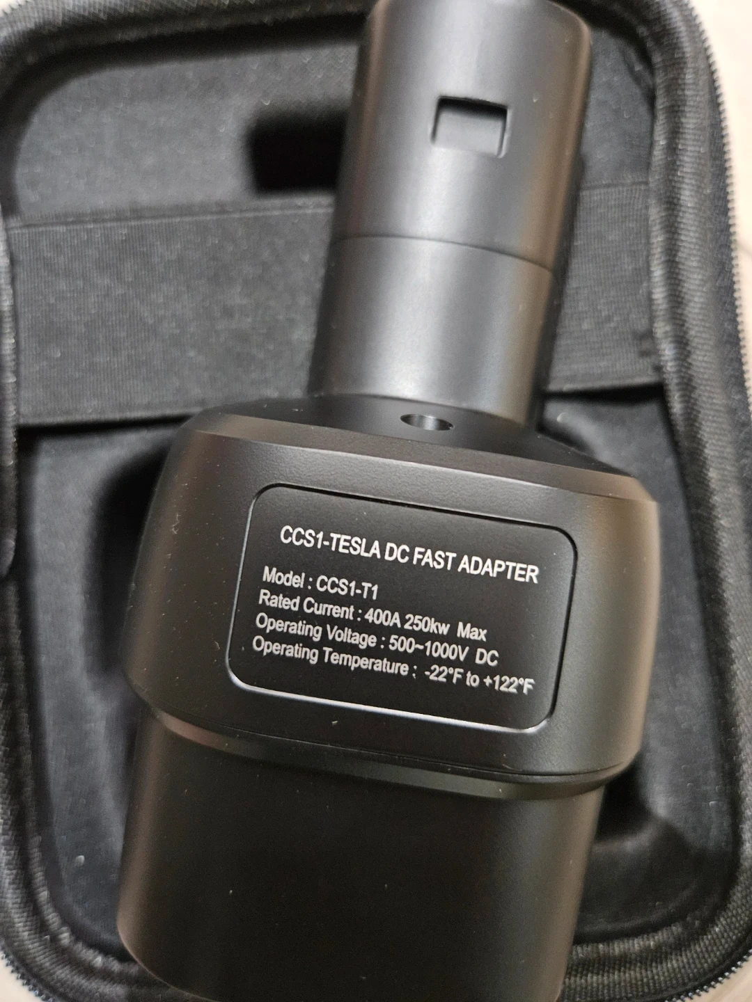 This CCS1-TESLA DC Fast Adapter is a Model CCS1-T1. It's rated for 400A max and operates at 500-1000V DC. The operating temperature range is -22°F to +122°F. Includes a protective carrying case.
