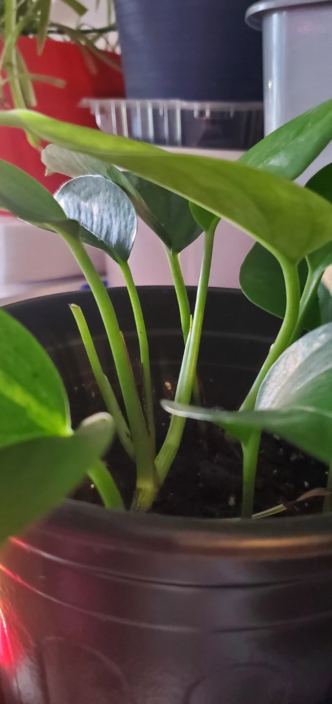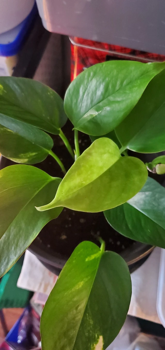 Healthy green pothos plant in a black pot. Its heart-shaped leaves have lovely variegation. This plant's easy-care nature makes it a popular choice for homes and offices.