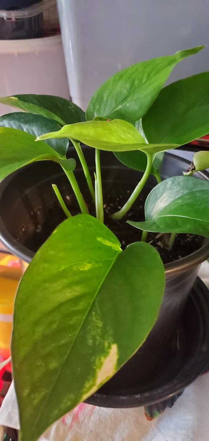 Healthy green pothos plant in a black pot. Its heart-shaped leaves have lovely variegation. This plant's easy-care nature makes it a popular choice for homes and offices.