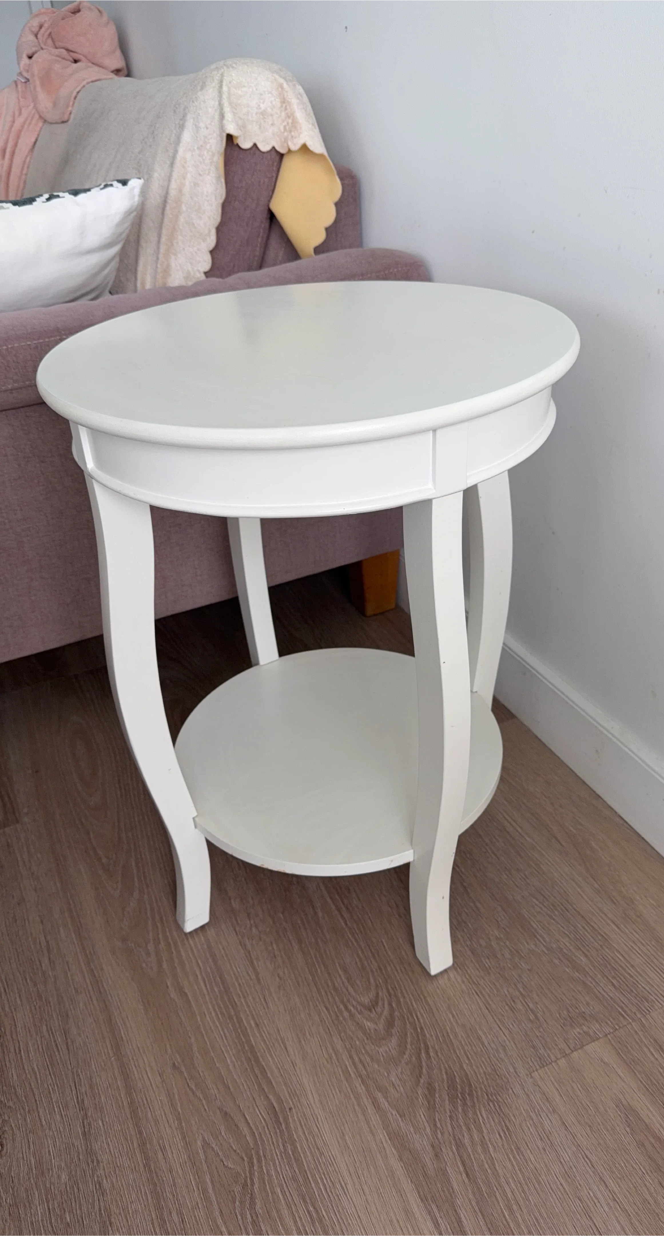 This white oval accent table has a lower shelf for extra storage. Its curved legs give it a classic look. Wood material.