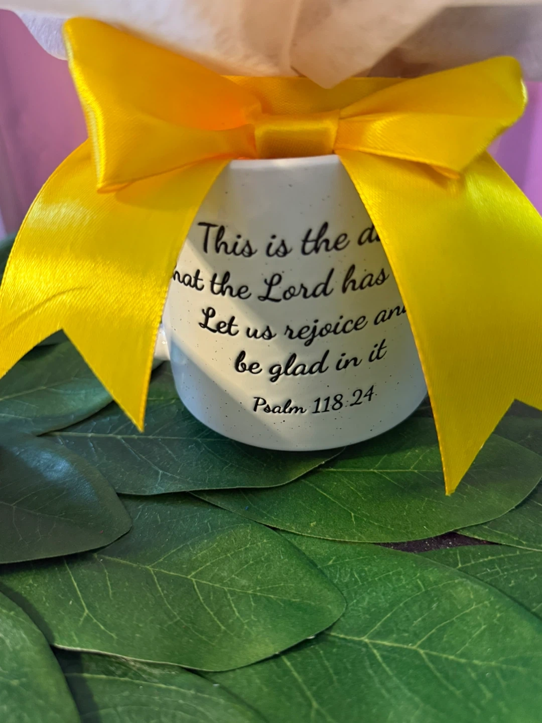 This white ceramic mug features a biblical quote and a bright yellow ribbon. It's adorned with a small bouquet of artificial blue and yellow roses, perfect for decoration. The mug has a textured finish.