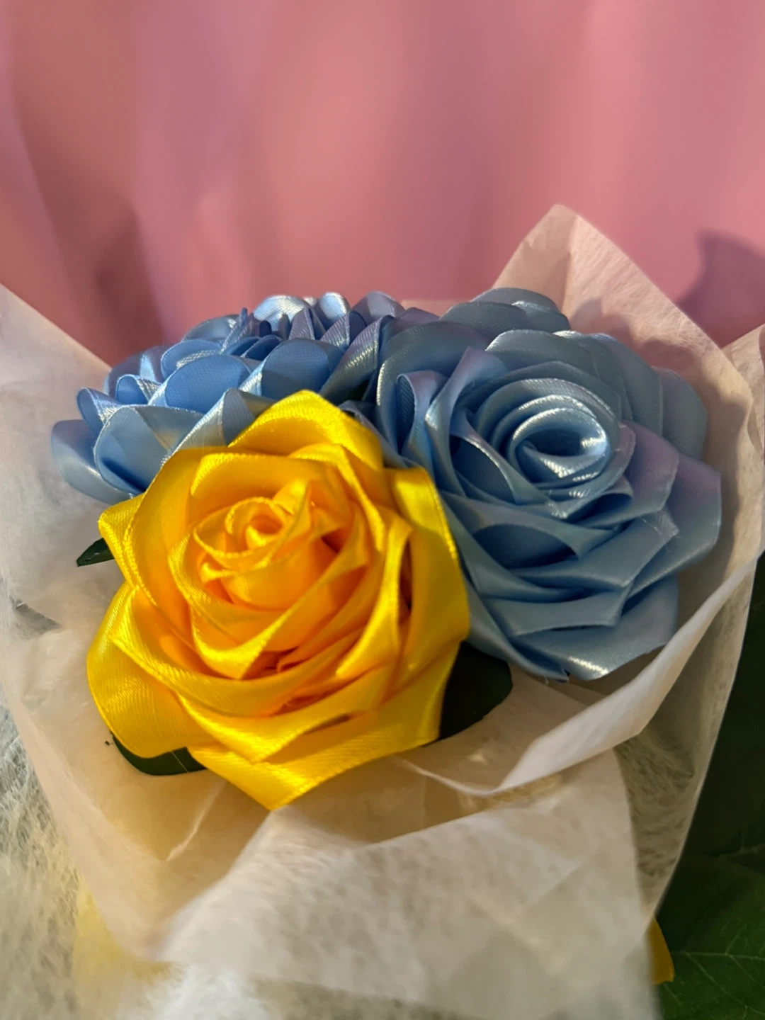 This white ceramic mug features a biblical quote and a bright yellow ribbon. It's adorned with a small bouquet of artificial blue and yellow roses, perfect for decoration. The mug has a textured finish.