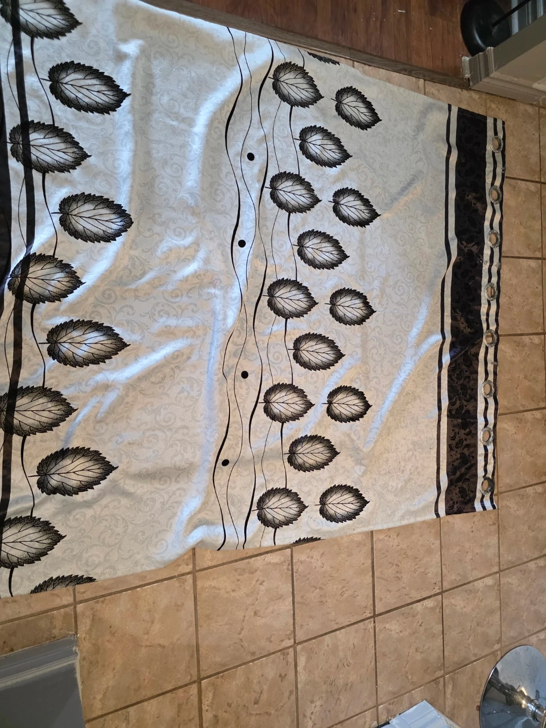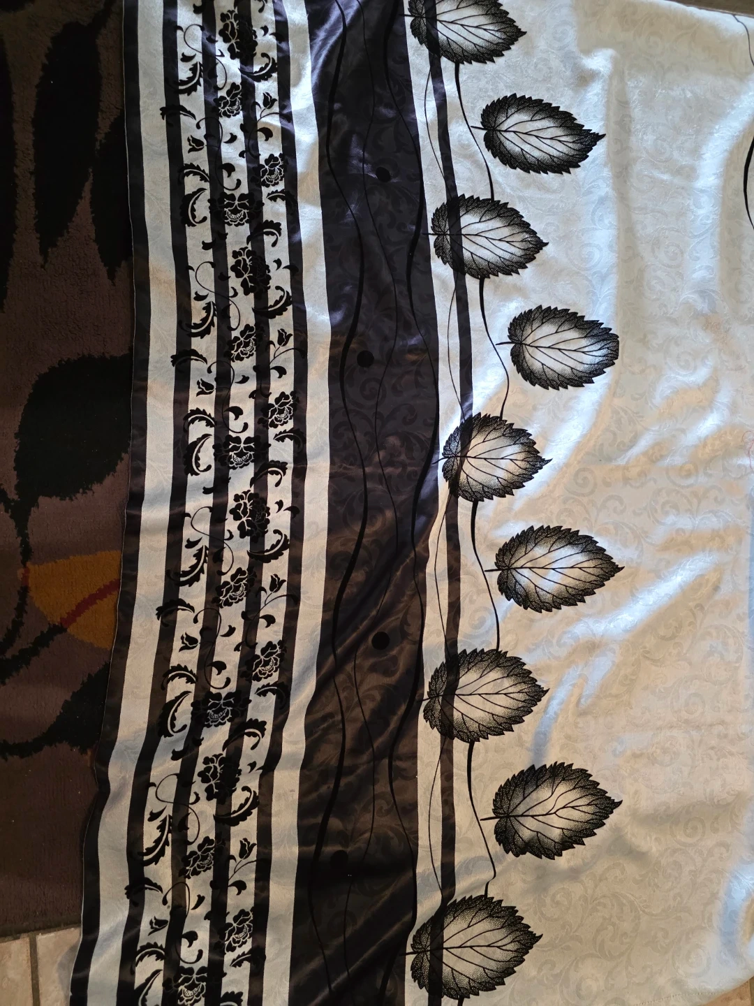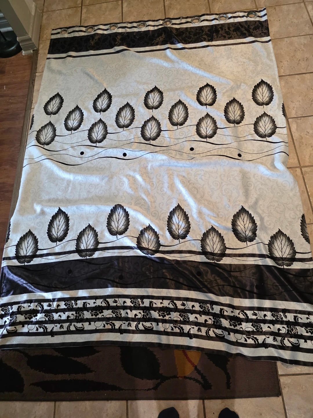 This decorative curtain panel features a repeating leaf pattern in black and white. It has a subtle damask background texture. The panel includes grommets for easy hanging. four piece. Silk