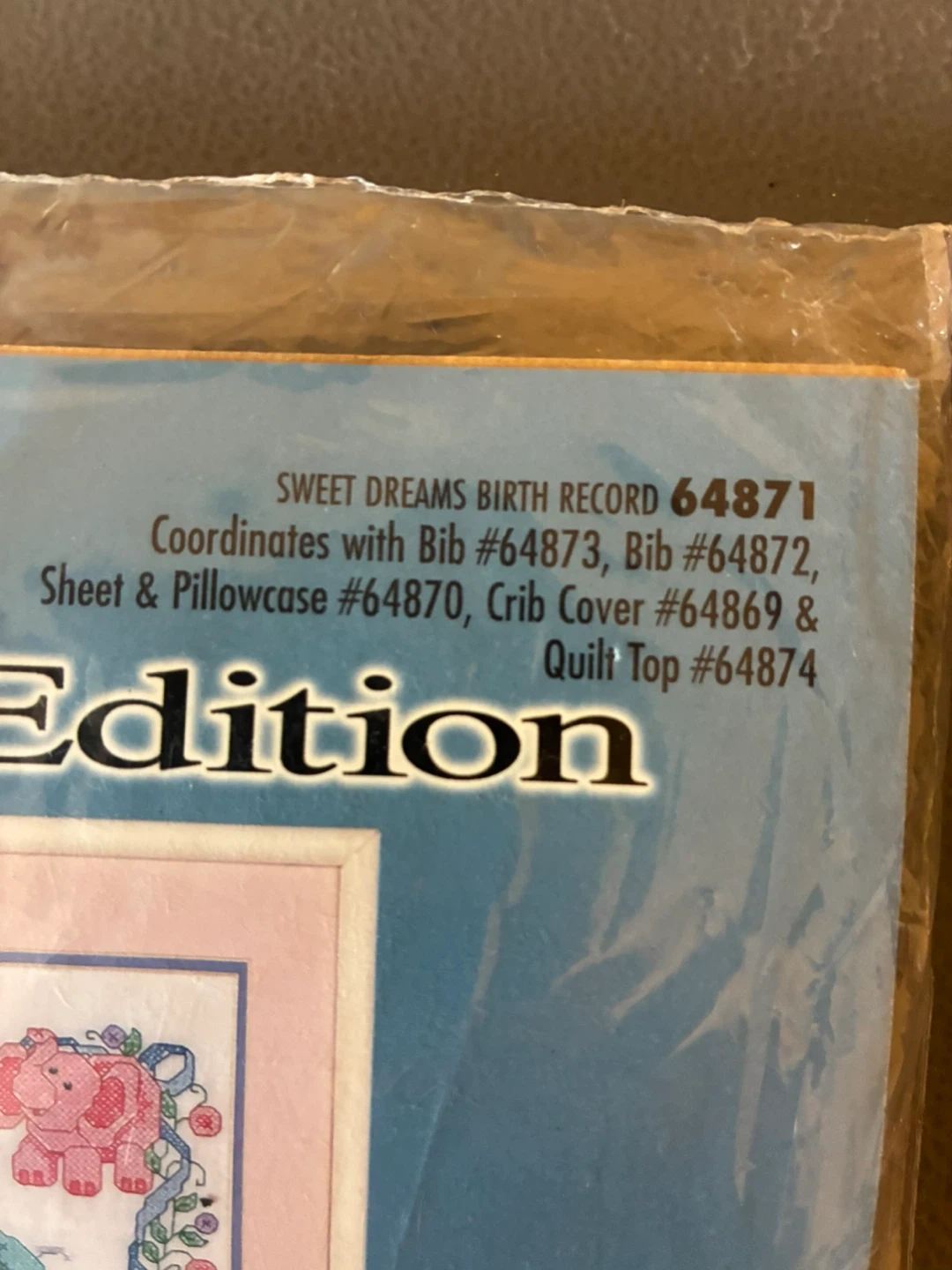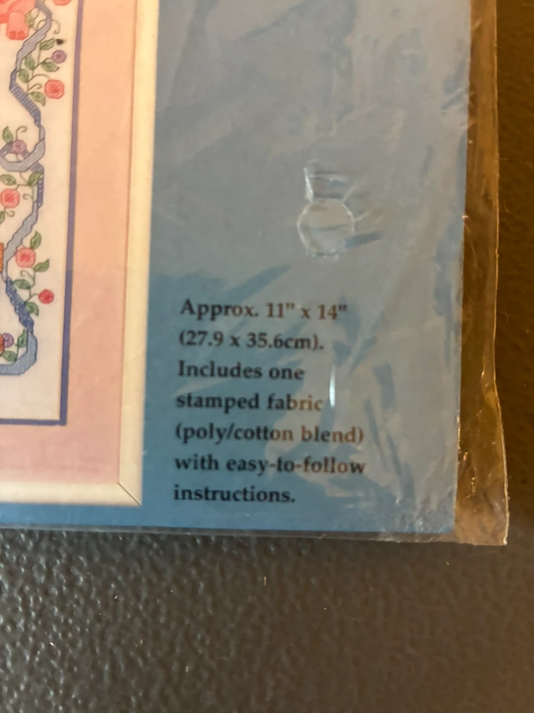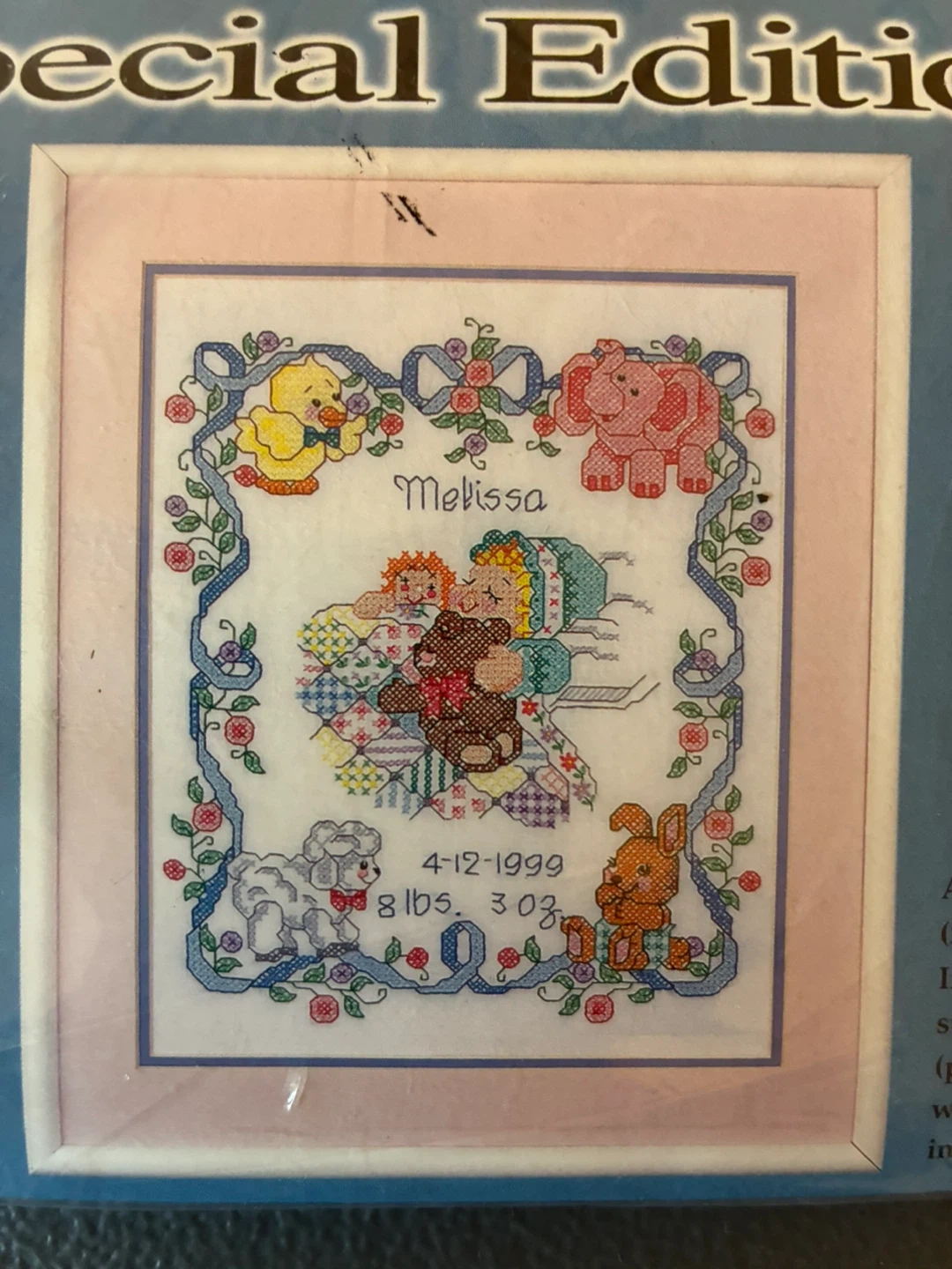 This Bucilla Special Edition "Sweet Dreams Birth Record" cross stitch kit is approximately 11" x 14". It includes one stamped fabric (poly/cotton blend) with easy-to-follow instructions. The kit is from 1999 and records a birth date of 4-12-1999 with weight 8 lbs 3 oz.