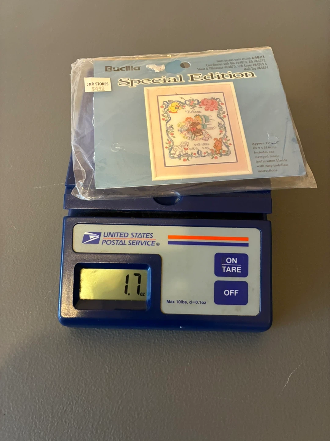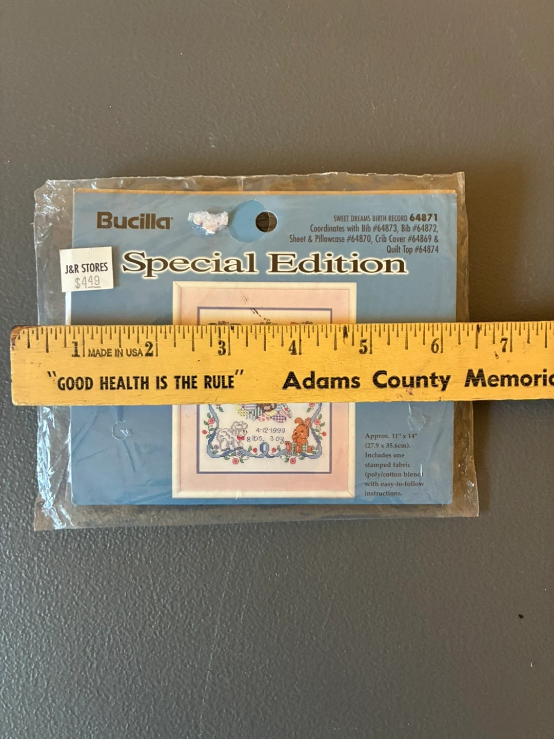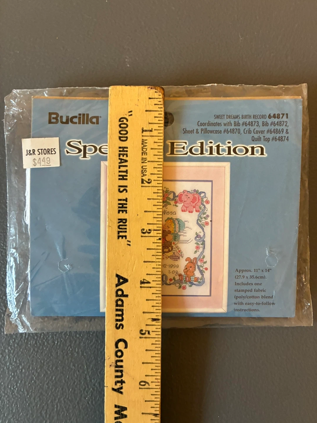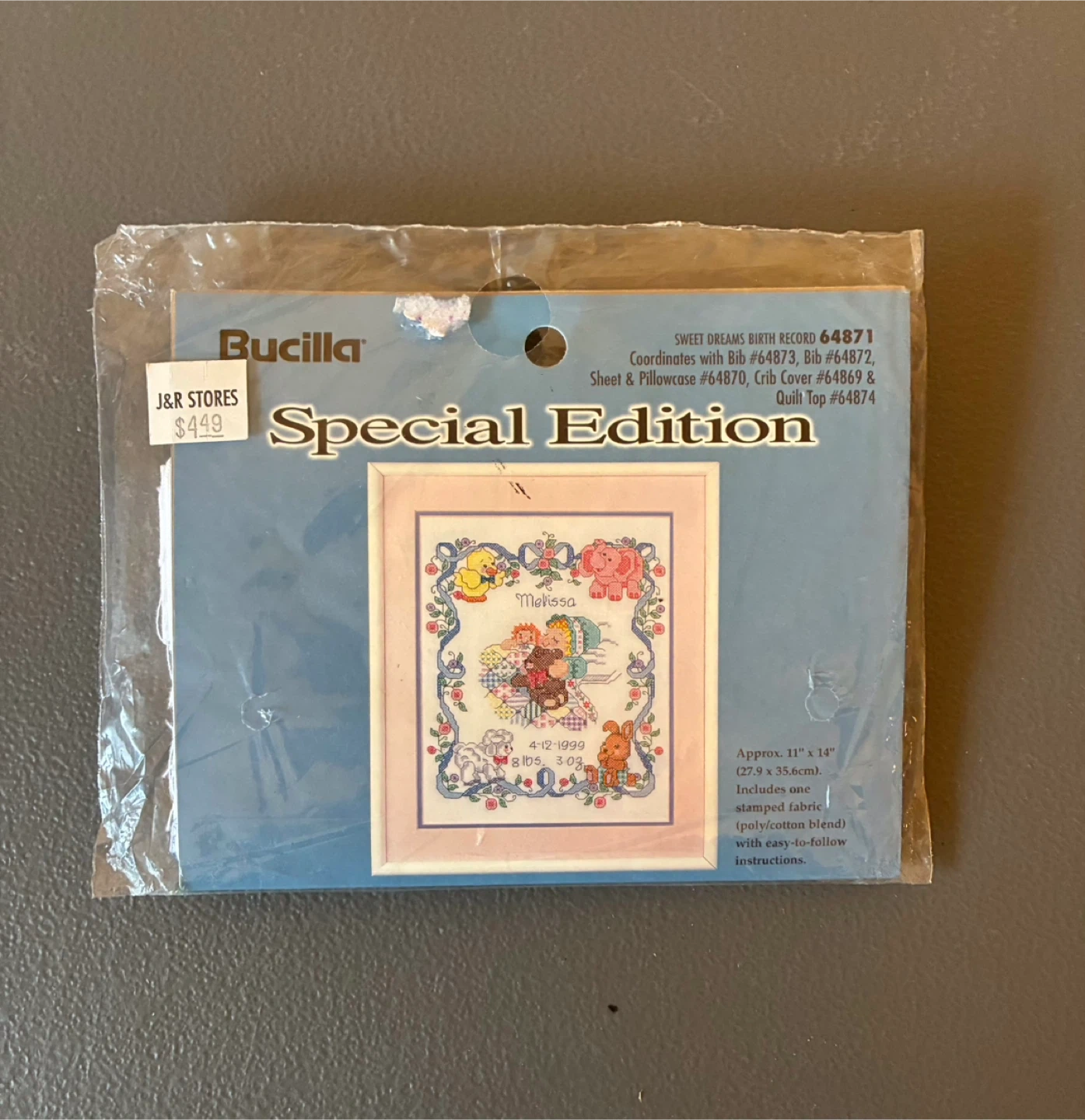 This Bucilla Special Edition "Sweet Dreams Birth Record" cross stitch kit is approximately 11" x 14". It includes one stamped fabric (poly/cotton blend) with easy-to-follow instructions. The kit is from 1999 and records a birth date of 4-12-1999 with weight 8 lbs 3 oz.