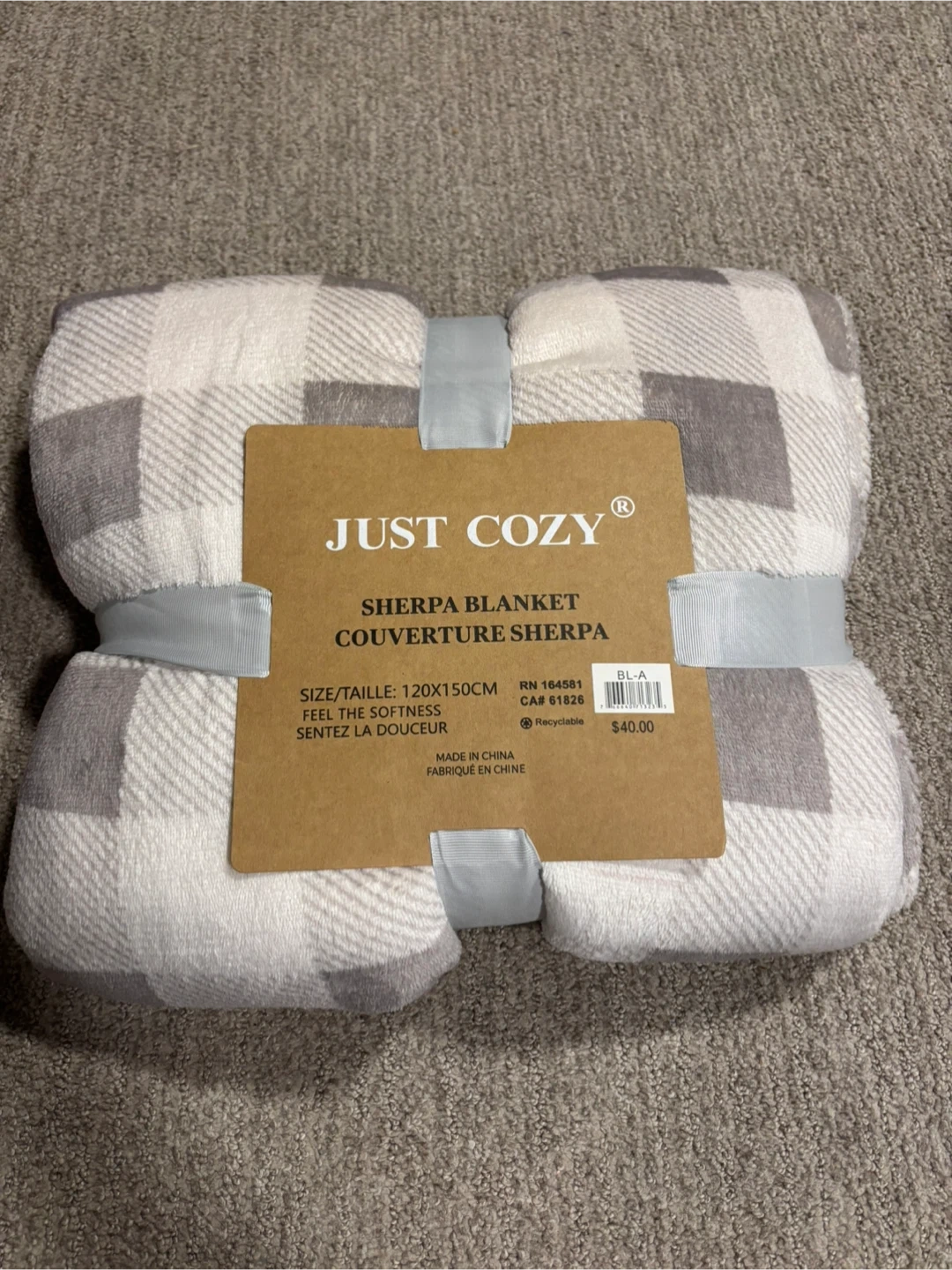 This JUST COZY sherpa blanket is super soft and cozy. It's a reversible design with a plaid pattern on one side and solid grey on the other. Dimensions are 120cm x 150cm.