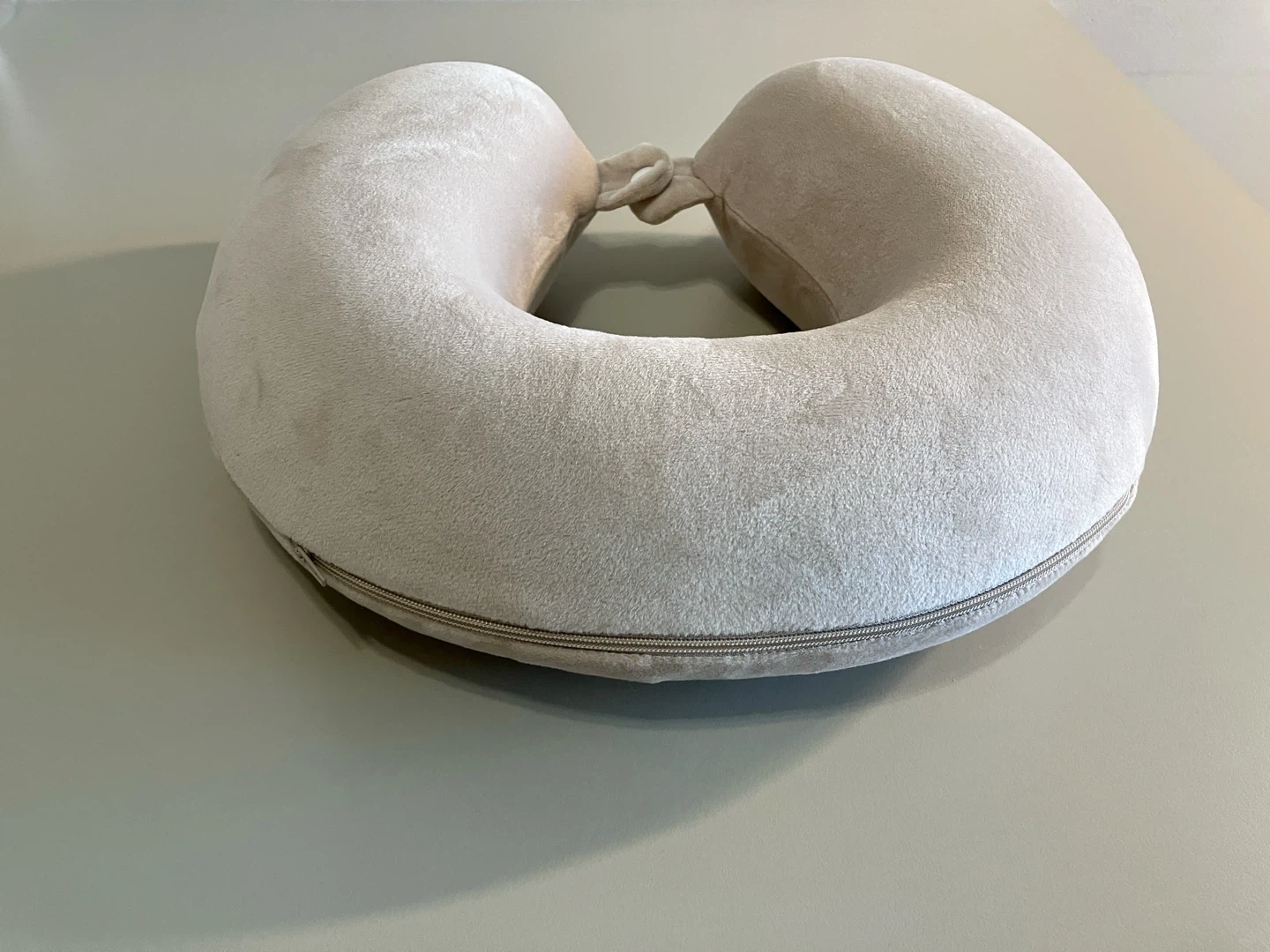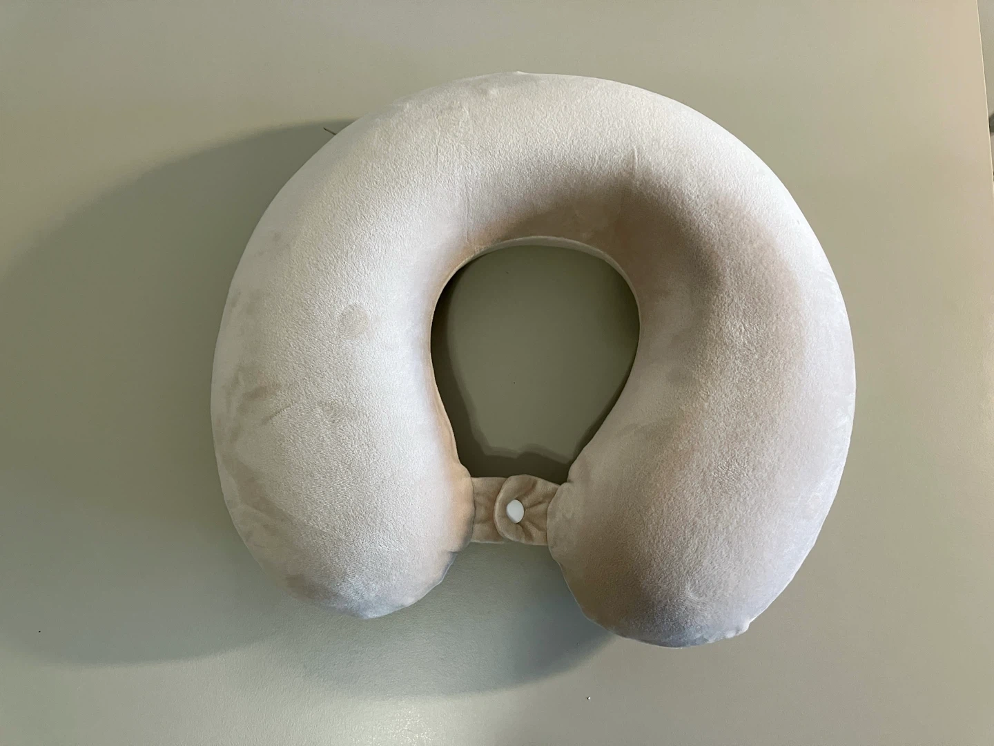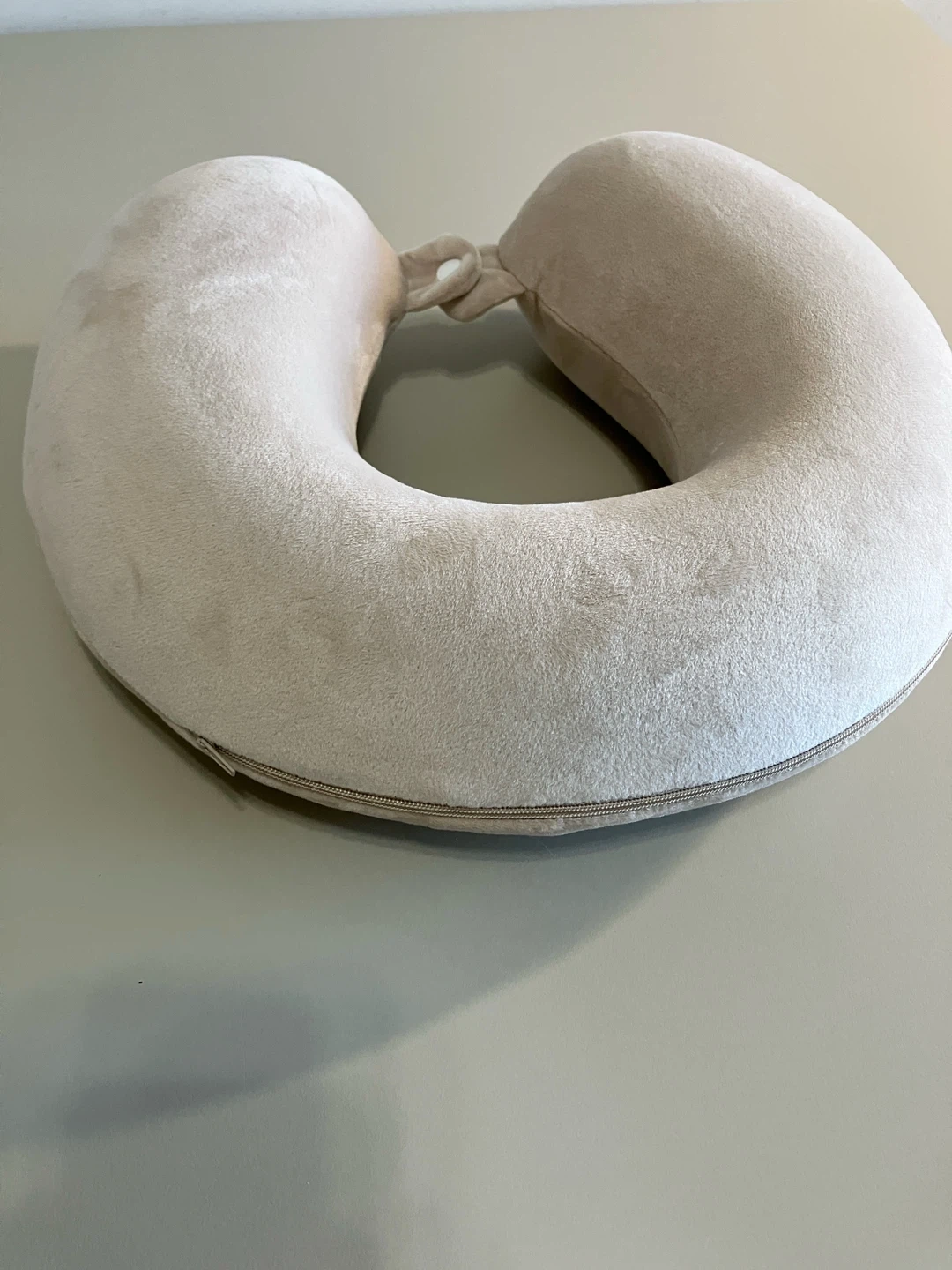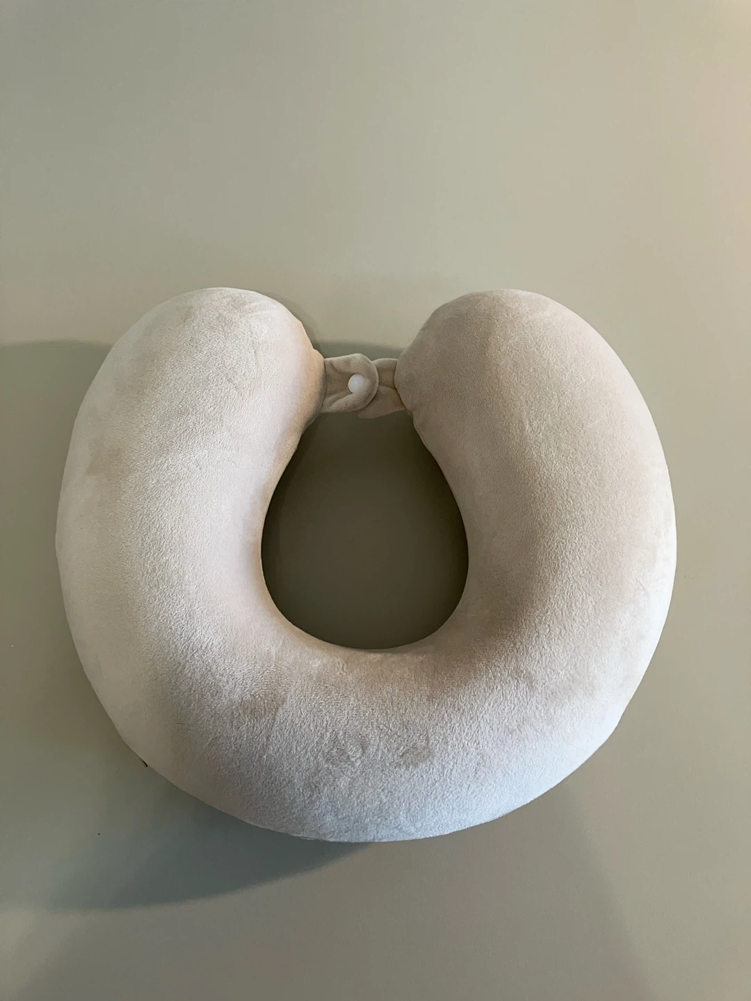 A soft travel neck pillow for comfort on the go. Made with a plush, velour-like material. The cover is removable via a zipper for easy cleaning. Bought from Japan.