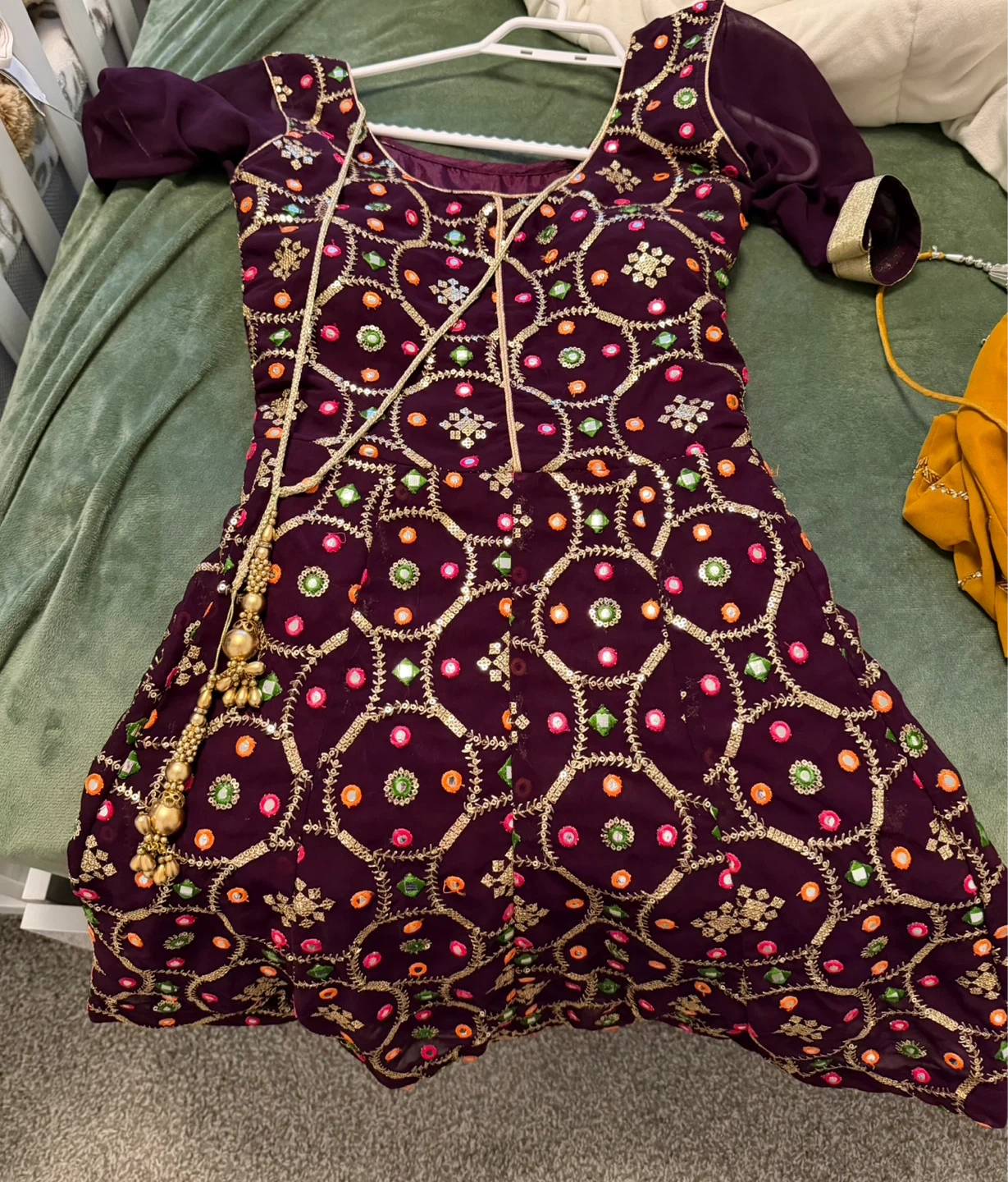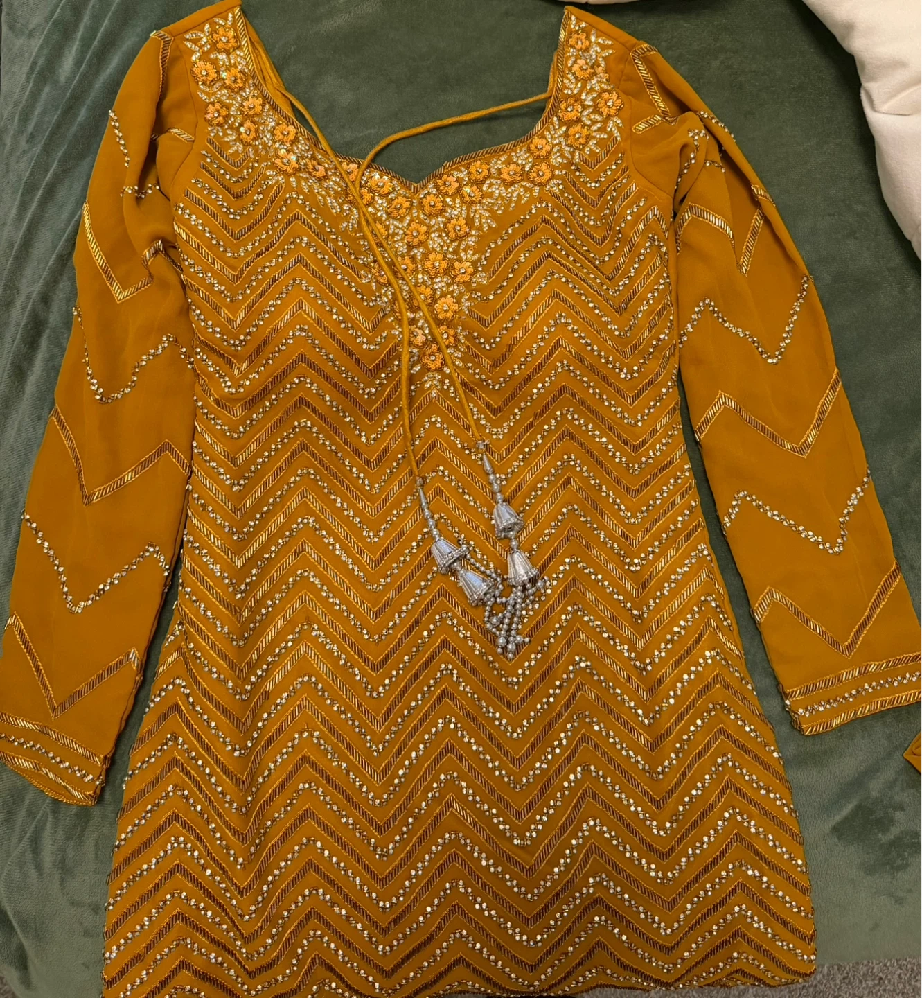 Beautifully embroidered mustard yellow kurti paired with matching pants and a sheer dupatta. Intricate beadwork and sequin embellishments adorn the outfit. Perfect for festive occasions or cultural events!