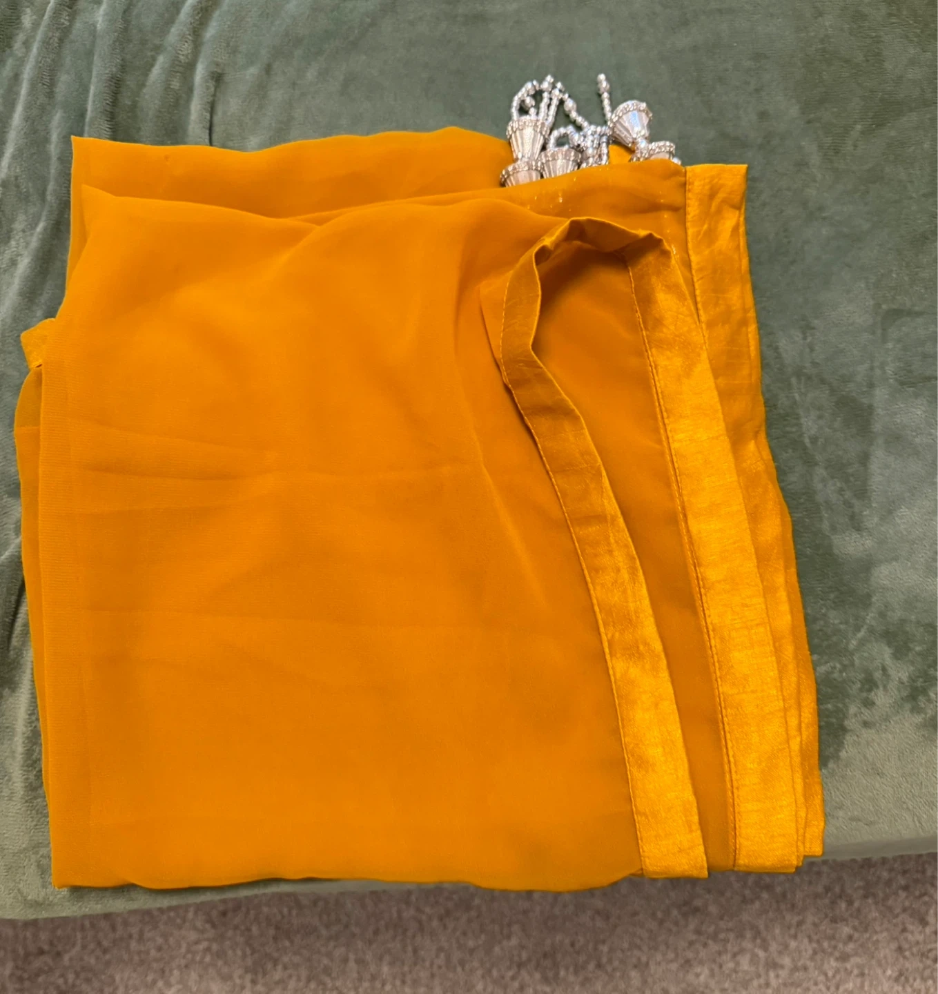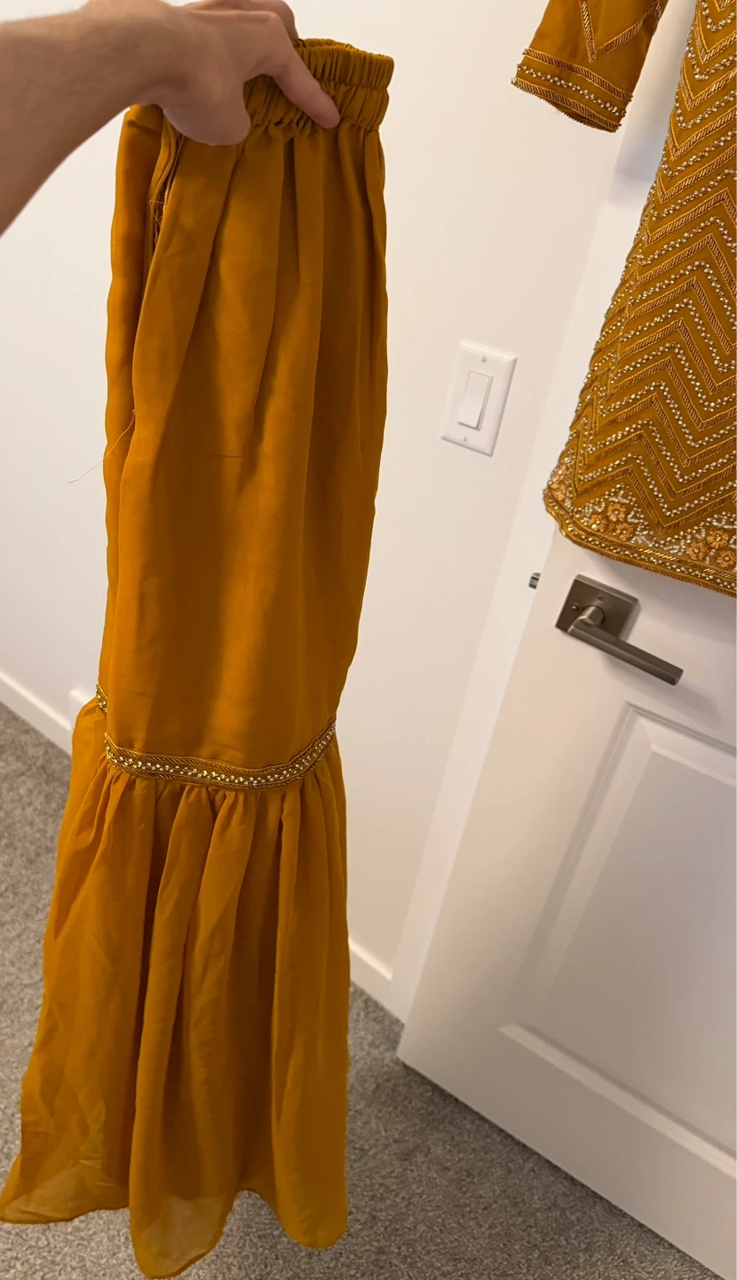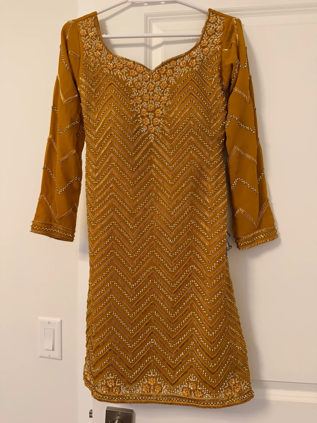 Beautifully embroidered mustard yellow kurti paired with matching pants and a sheer dupatta. Intricate beadwork and sequin embellishments adorn the outfit. Perfect for festive occasions or cultural events!