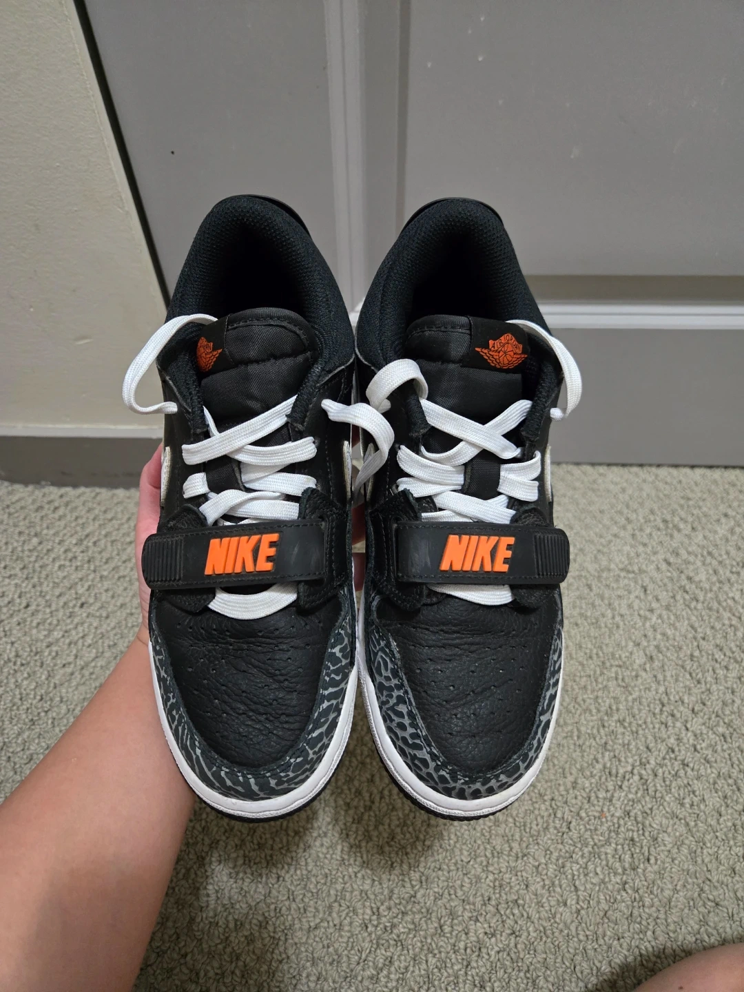 These Nike Air Jordan 3 sneakers are black with orange accents and a white sole. They feature a Nike strap across the top of the foot.