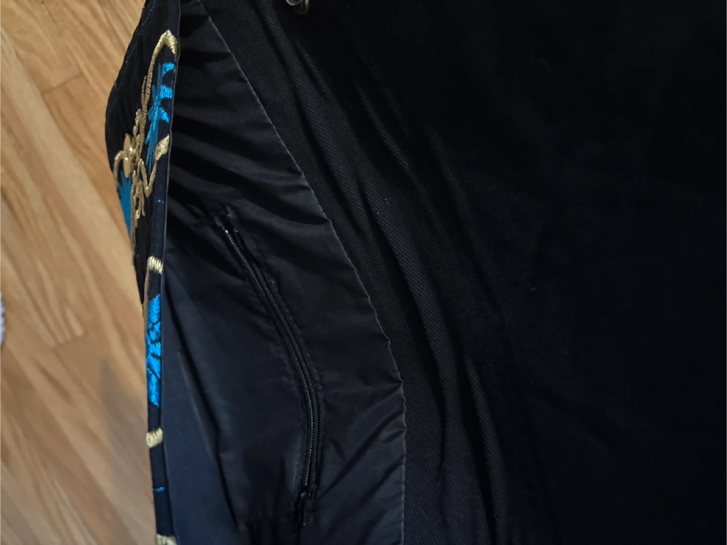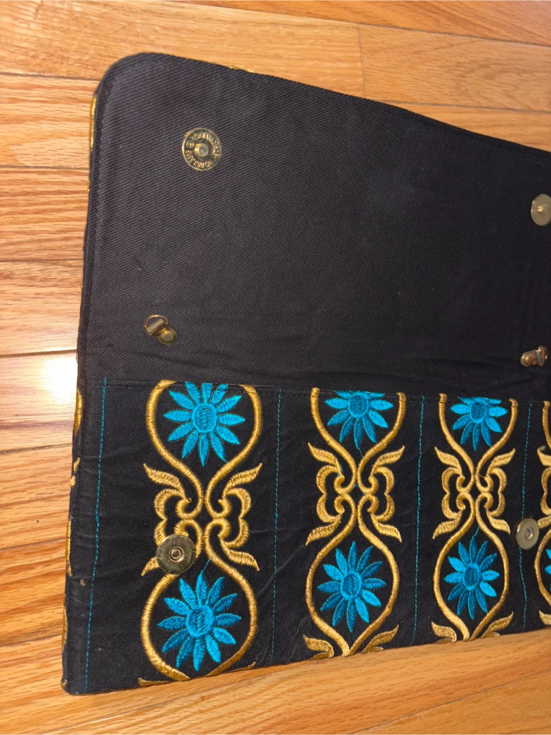 Black clutch purse with vibrant blue and gold floral embroidery. It has a zippered pocket inside and a magnetic snap closure. A stylish accessory for any occasion!