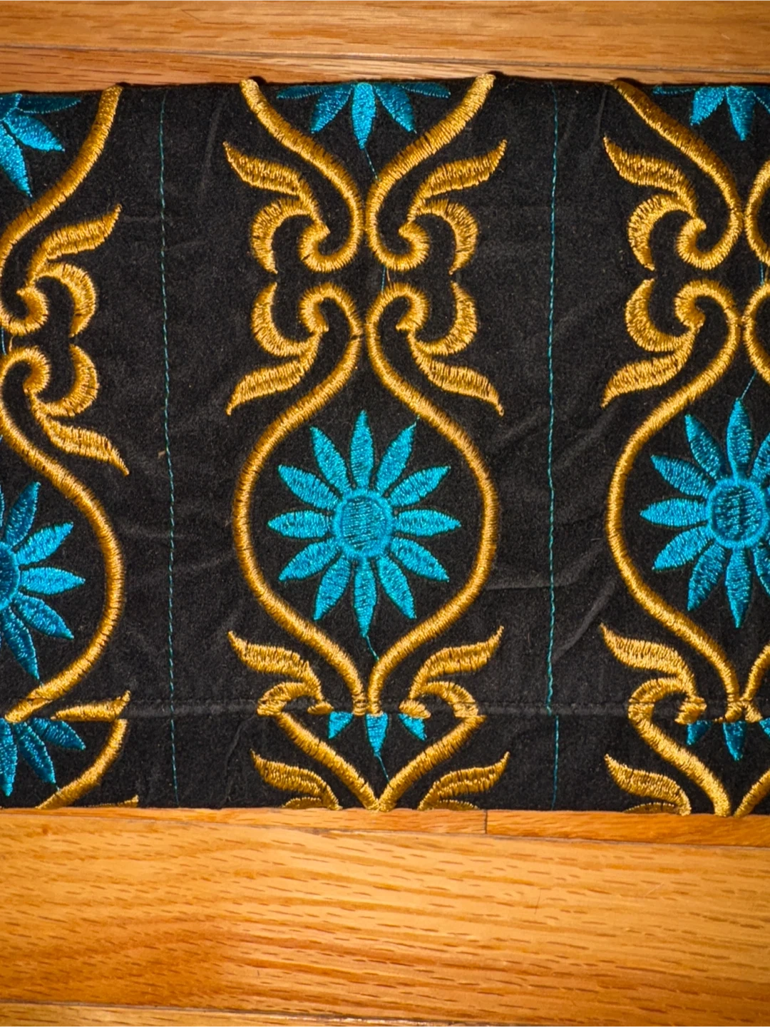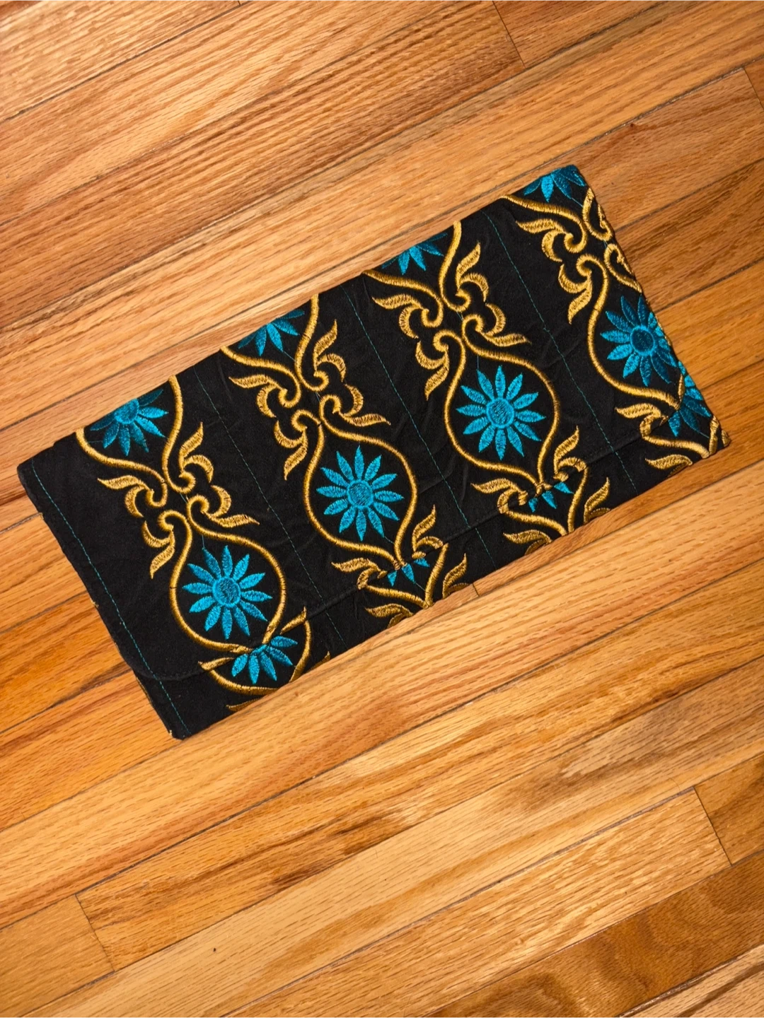 Black clutch purse with vibrant blue and gold floral embroidery. It has a zippered pocket inside and a magnetic snap closure. A stylish accessory for any occasion!