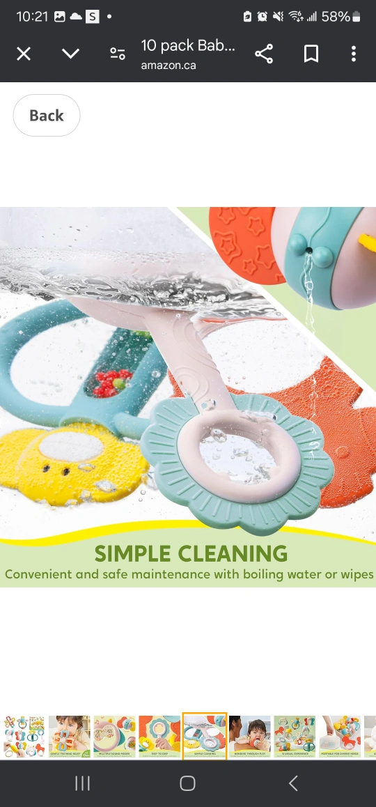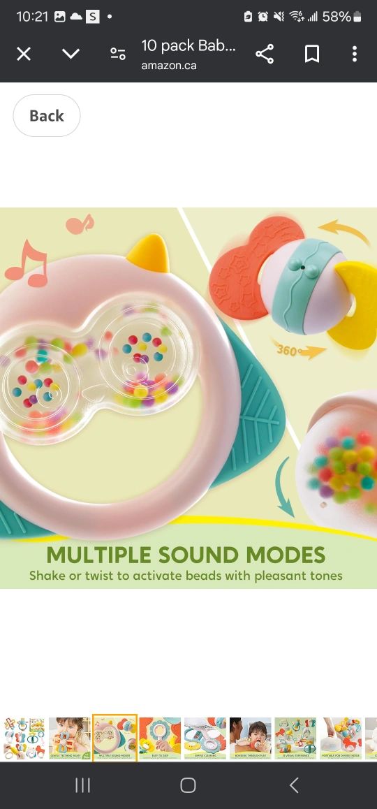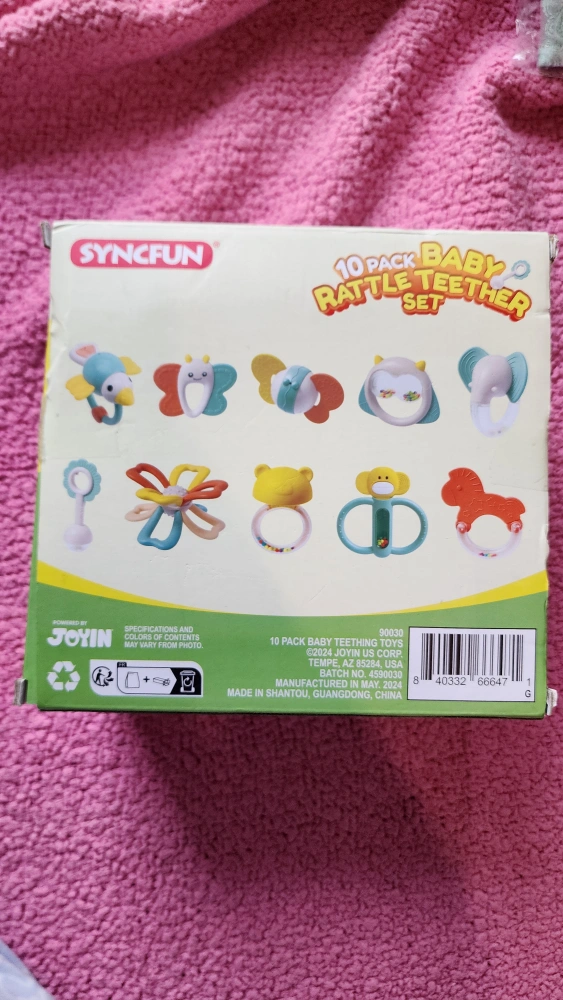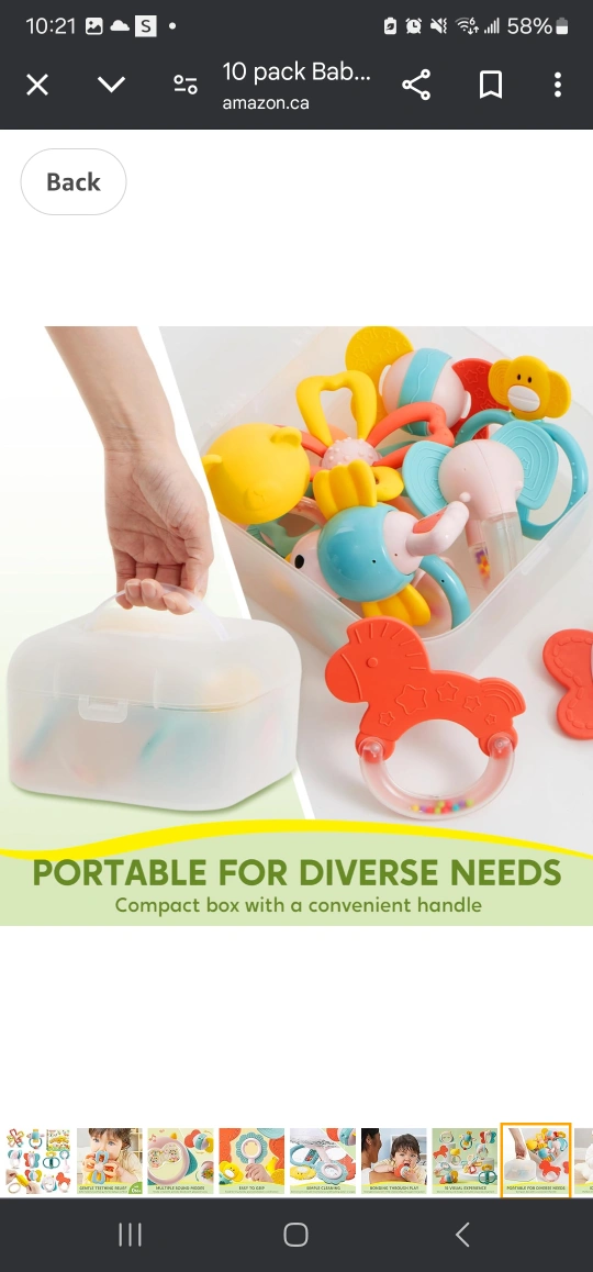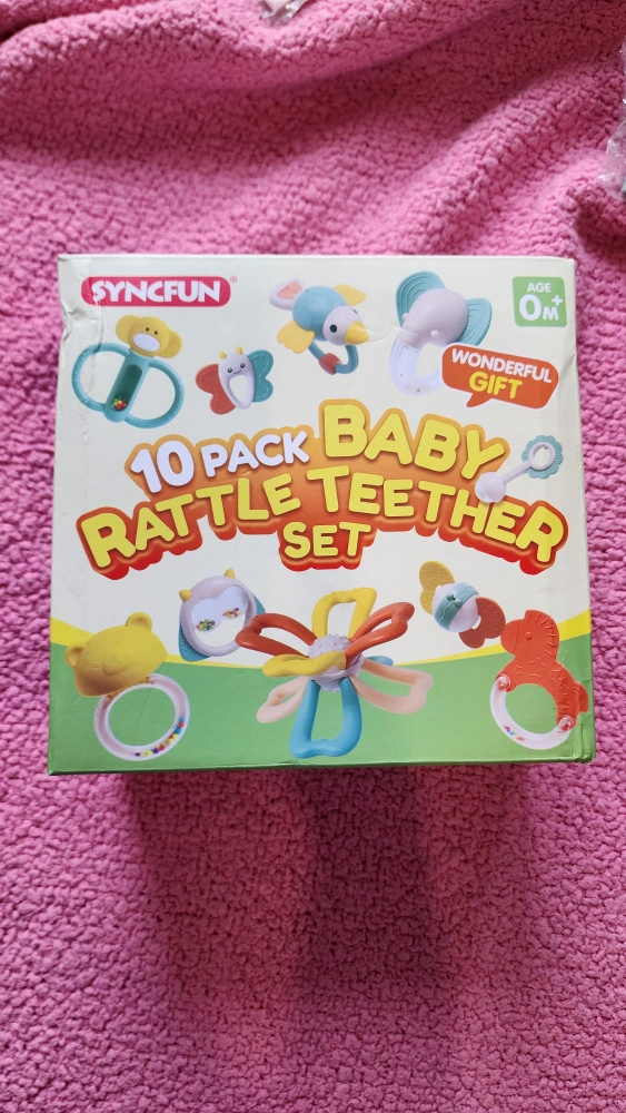 Ten-piece baby teether set. Includes various colourful designs. Portable storage box. Easy to clean. Multiple sound modes.