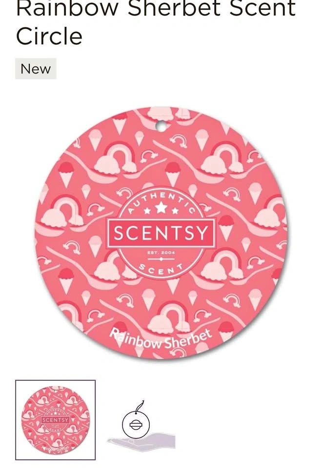 Sweet Scentsy Rainbow Sherbet Scent Circle. Brand new, never used. Smells like yummy rainbow sherbet. Good for cars, closets, or small spaces.
