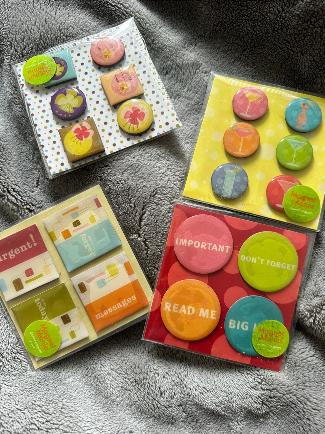 Set of Magnet Mania domed magnets featuring fun designs and messages like 'Important', 'Don't Forget', and 'Read Me'. Includes a set with cocktail graphics and another with floral motifs. They're great for the fridge, office, school or any magnetic surface!