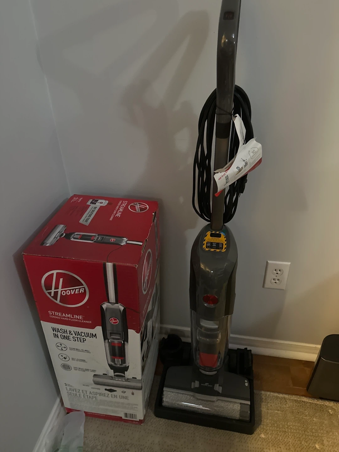 This Hoover Streamline wash and vacuum cleaner is designed for hard floors. It's a corded unit that cleans and vacuums in one step. Features self-cleaning brushes for easy maintenance. Great for cleaning right up to baseboards and edges! Plug in and self clean and comes with 1 bottle liquid solution