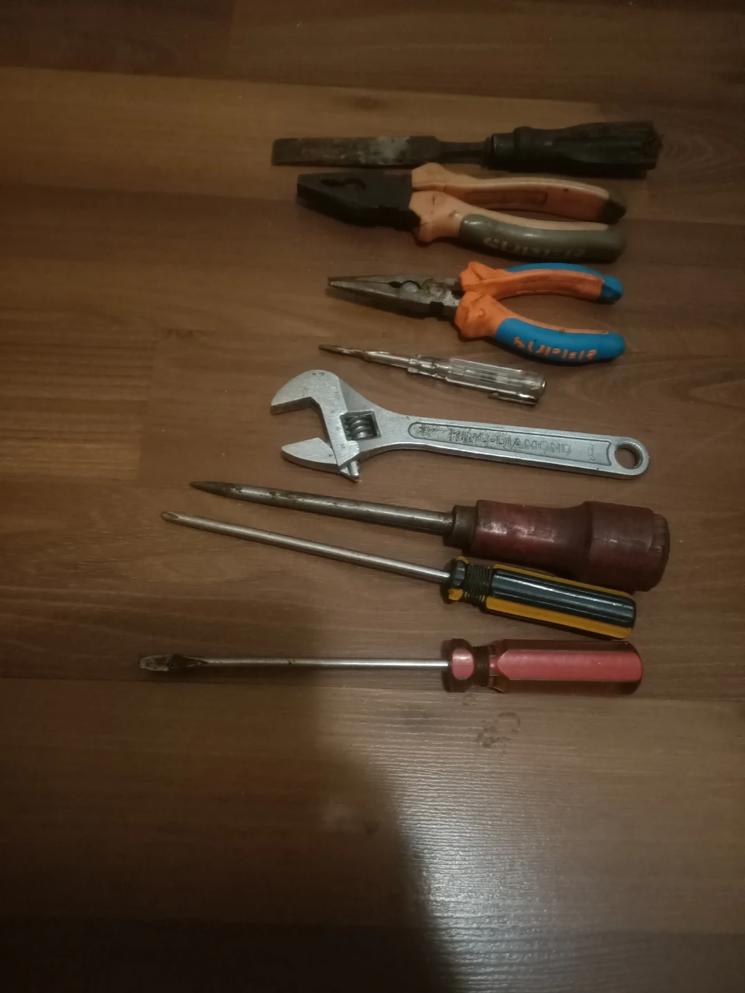 This is a collection of assorted hand tools. It includes pliers, cutting nose pliers, scre wrench, piercing awl, wood chisel, 3 screw drivers l, flat and Phillips.These tools are suitable for various DIY and repair tasks.