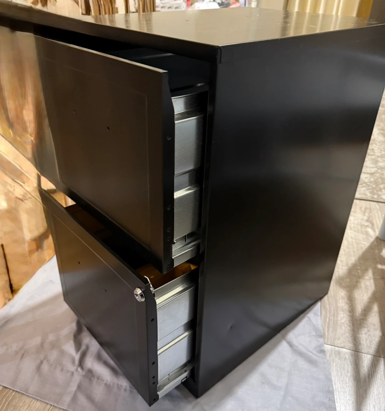 Selling a black, two-drawer filing cabinet. It's in good condition and ready to organize your documents! Perfect for a home office or small business. The drawers slide smoothly, and the cabinet is sturdy.