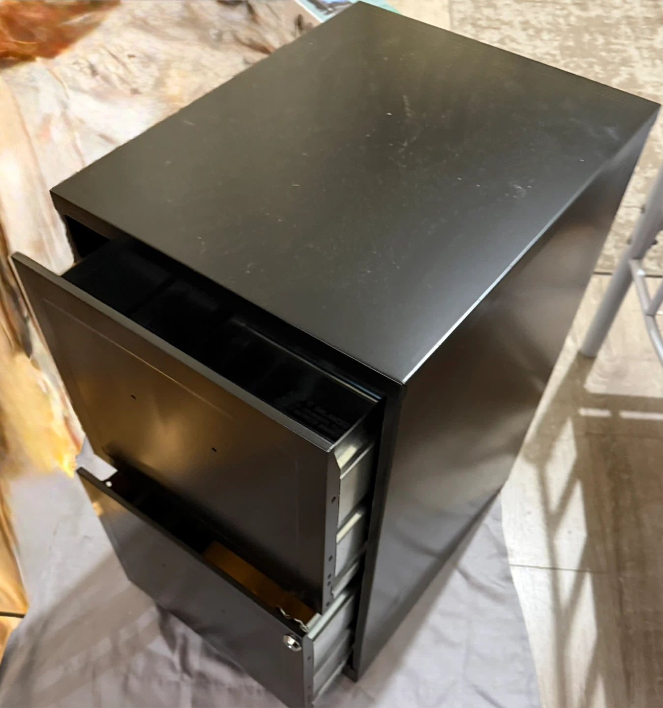 Selling a black, two-drawer filing cabinet. It's in good condition and ready to organize your documents! Perfect for a home office or small business. The drawers slide smoothly, and the cabinet is sturdy.
